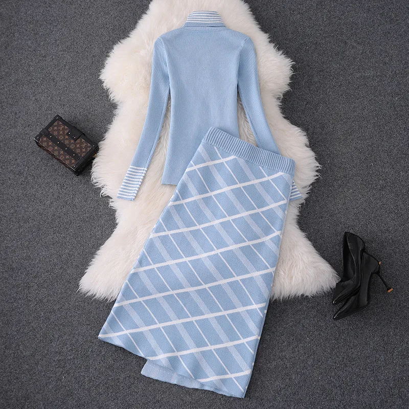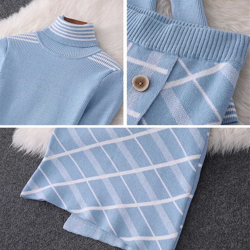 Женский дизайнерский костюм из двух предметов, вязаный свитер с высоким воротником и клетчатая юбка, офисный костюм, костюм-двойка на осень и зиму