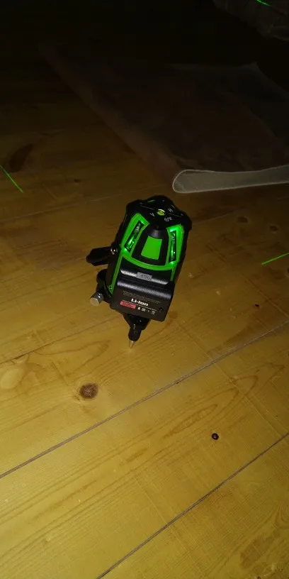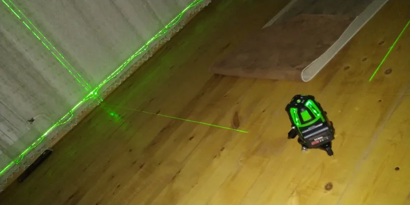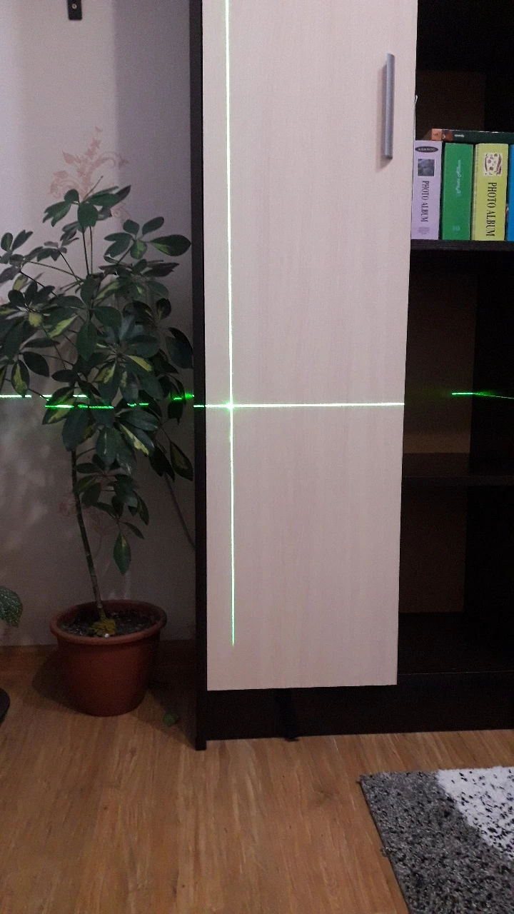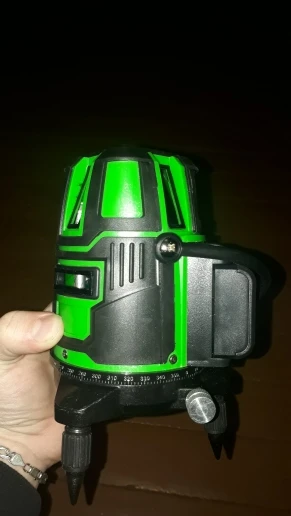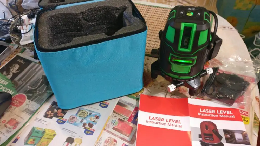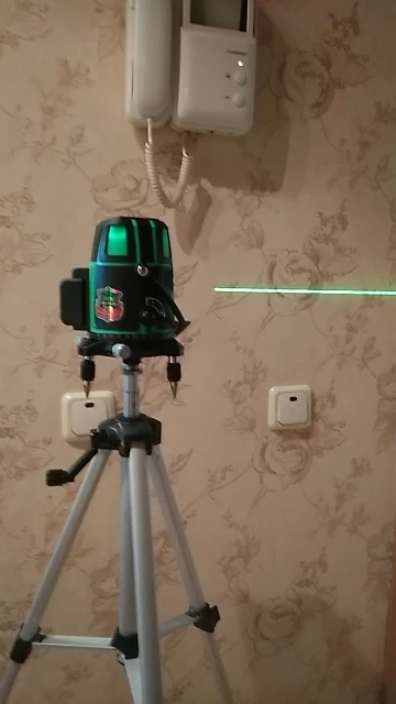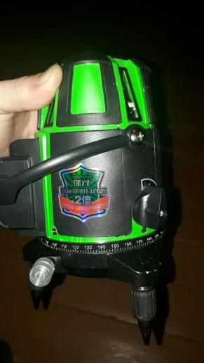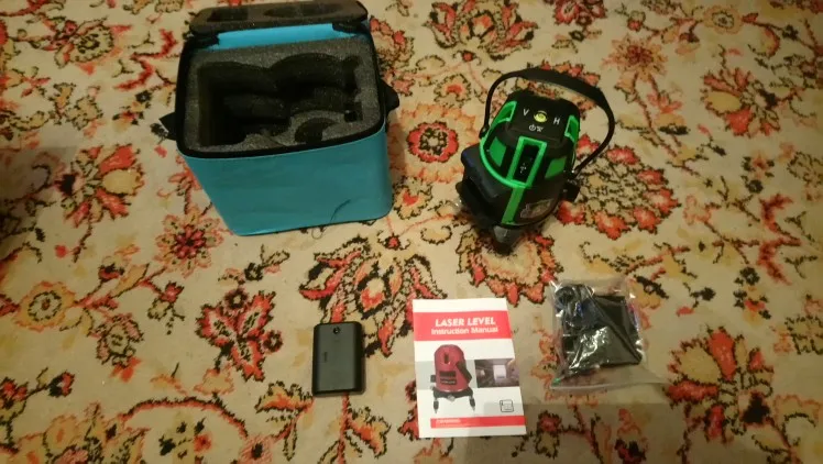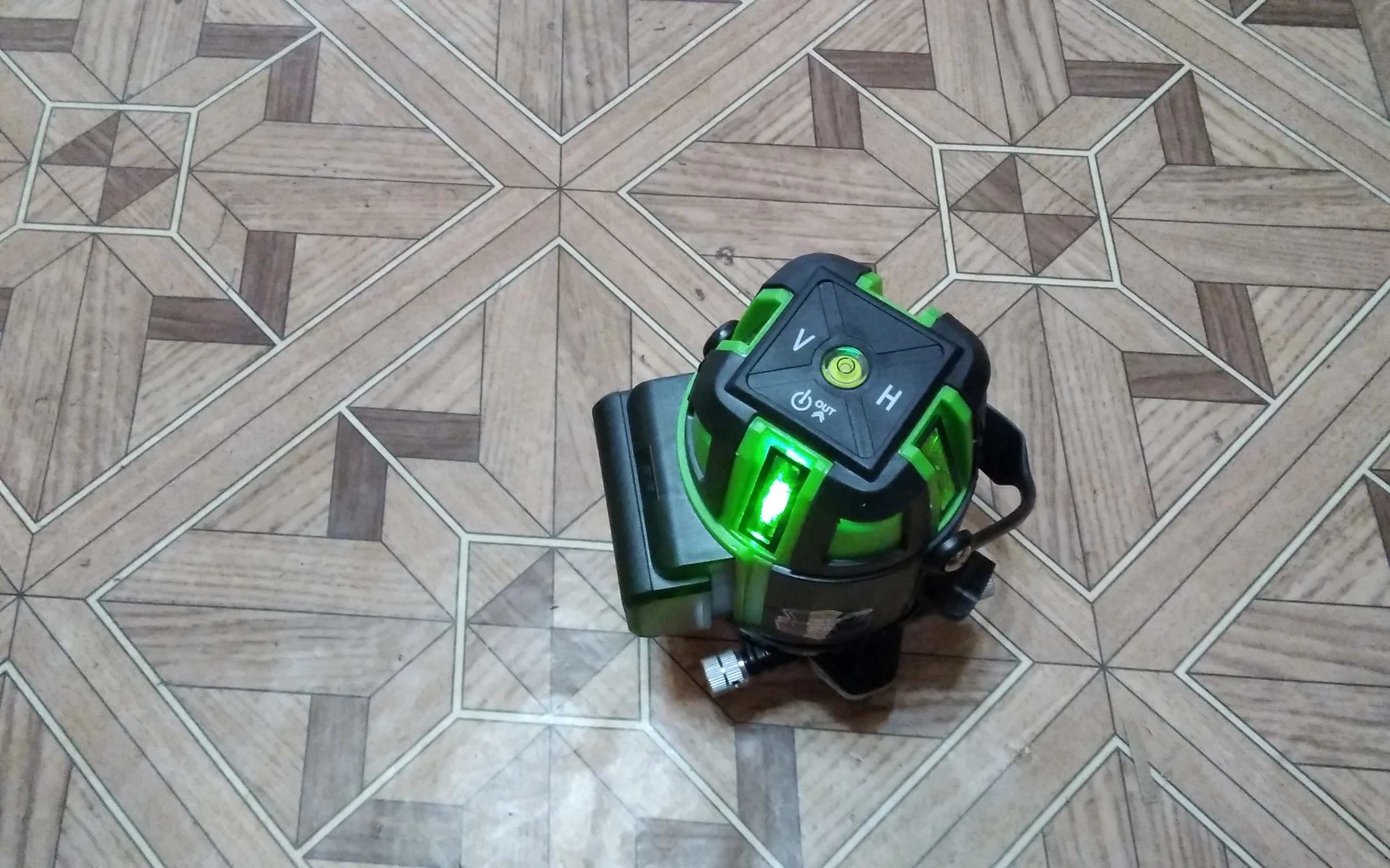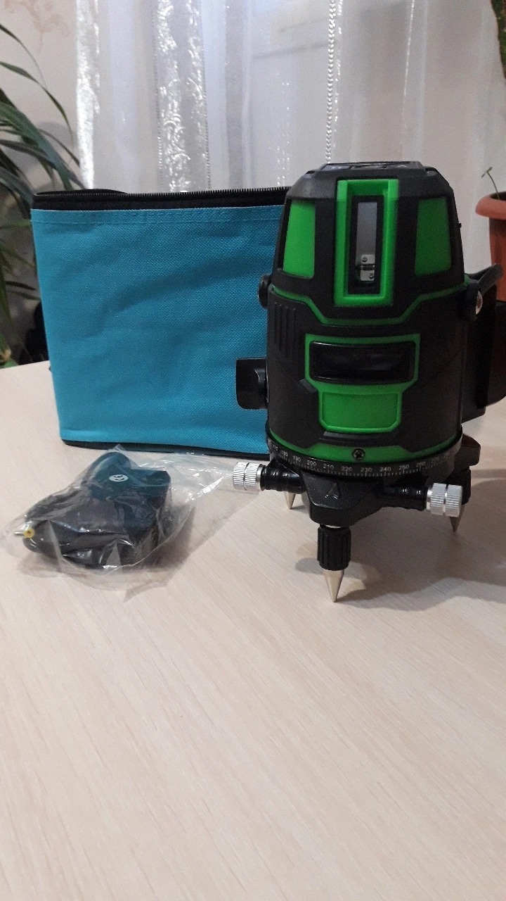 Уровень прибыл за 6 дней в целостности. Сборка и внешний вид удовлетворительные. Заказал с 5 лучами. Внизу отвес в виде красного луча. Проверить точность не могу, т.к. не с чем сравнить. Чтобы отключить пищалку надо нажать на OUT в течении 5 сек. После чего можно крепить в любом положении. Аналогично чтобы включить. Наклонил уровень и направил на жалюзи днем. С 6.5 метров хорошо видно точку. Линии я вижу также хорошо. Это лично мое мнение, так как не работал с таким инструментом. Дома есть кронштейн от советского Зенита. Подошел к уровню лучше всяких штативов и магнитных держалок. Советую такую приспособу. В итоге, денег за него не жалко. А такой прибор необходим в хозяйстве.