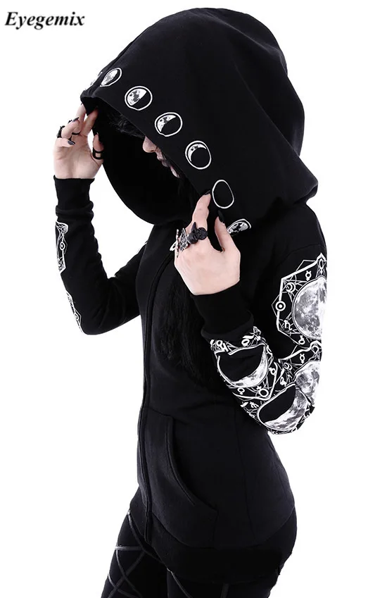 Женская толстовка с капюшоном, черная кофта на молнии с длинным рукавом, в готическом стиле, с буквенным принтом Луны, на осень-зиму, 5XL, 2020