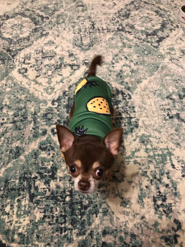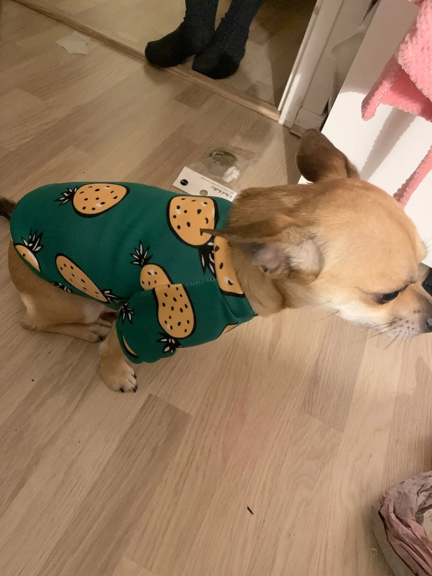 J’ai un chihuahuax de 5 kilo ( oui c’est un chihuahuax grande taille ) et il est légèrement trop petit pour lui j’aurais dû prendre la taille L . Mais en tout cas il est trop beau le pull et j’ai reçu très rapidement