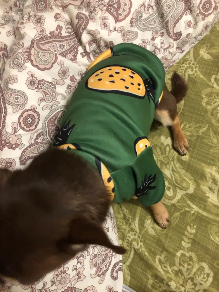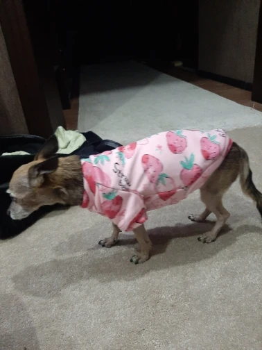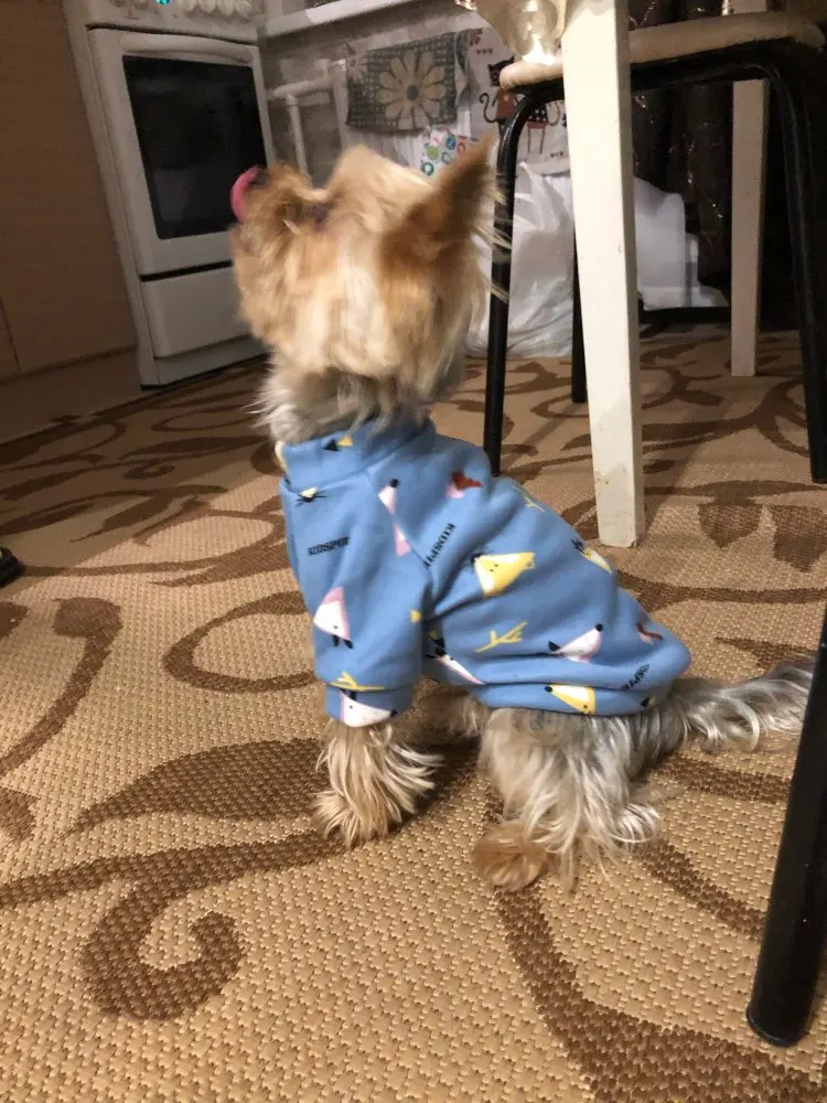 Такую кофточку покупаем второй раз, первая уже мала, по длине нам как раз, но повторюсь, моя собака худая, поэтому в задней части кофта будто топорщится, широковата. А горлышко очень узкое, еле продели голову, на более полную собаку не налезло бы на голову. За узкое горлышко сняла 1 звезду, а так очень классная кофта