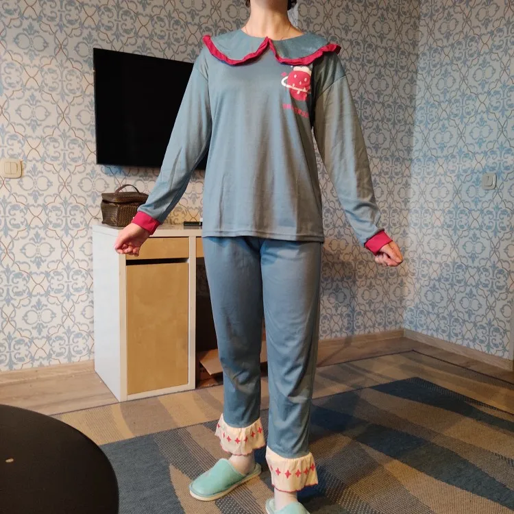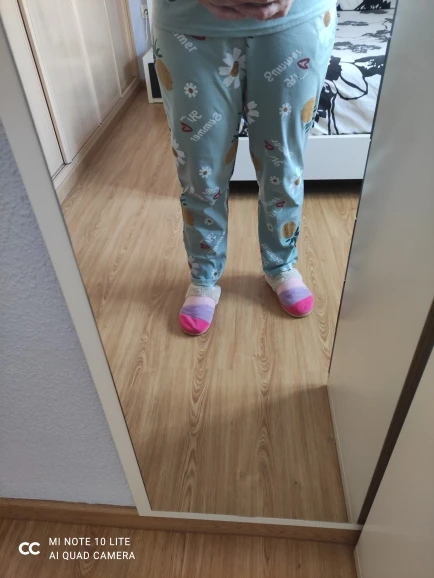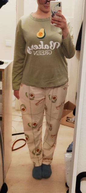 Пижама приятная, у меня рост 164 и размеры XS-S, но брала размер L (сверялась с таблицей продавца). Надо было брать M... Тогда подошло бы идеально. В целом, пижамка как на фотке, всё соответствует описанию