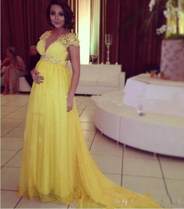 2021 ярко-желтые шифоновые длинные вечерние платья с коротким рукавом для беременных женщин Формальные Вечерние платья для выпускного вечера с бусинами в стиле ампир