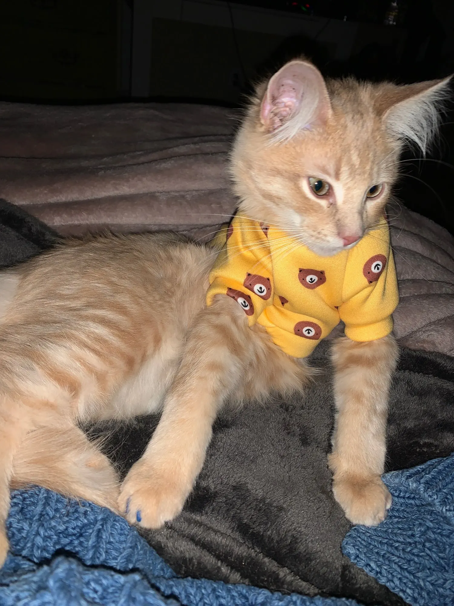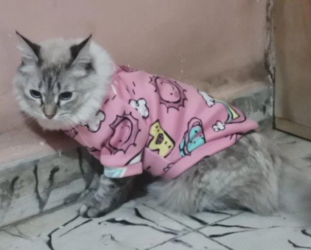 Хорошая кофточка, с подкладкой, сшита хорошо, в паре мест торчат нитки, но это не критично. Брала на 2-х месячного сфинкса, оказалась великовата (заказывала без замеров), так что будет на вырост. Дошло быстро, потом ещё закажу)