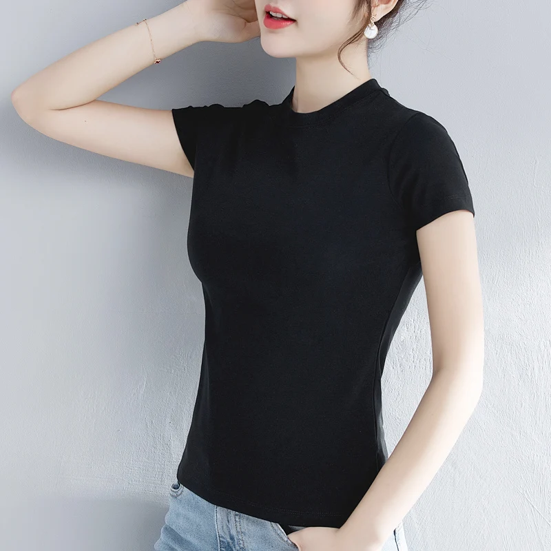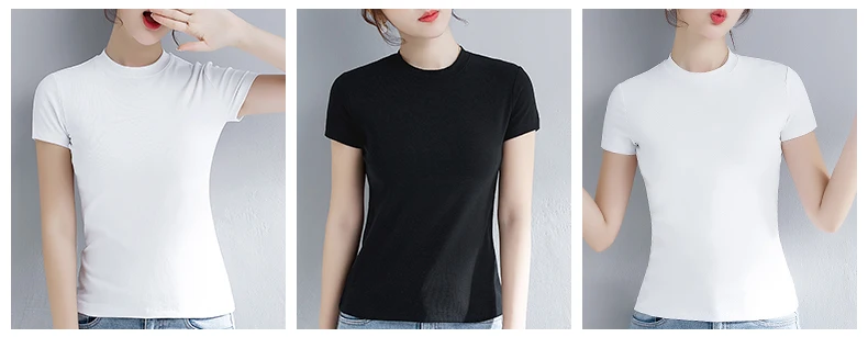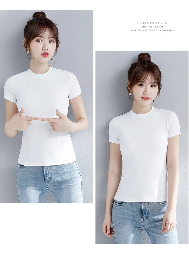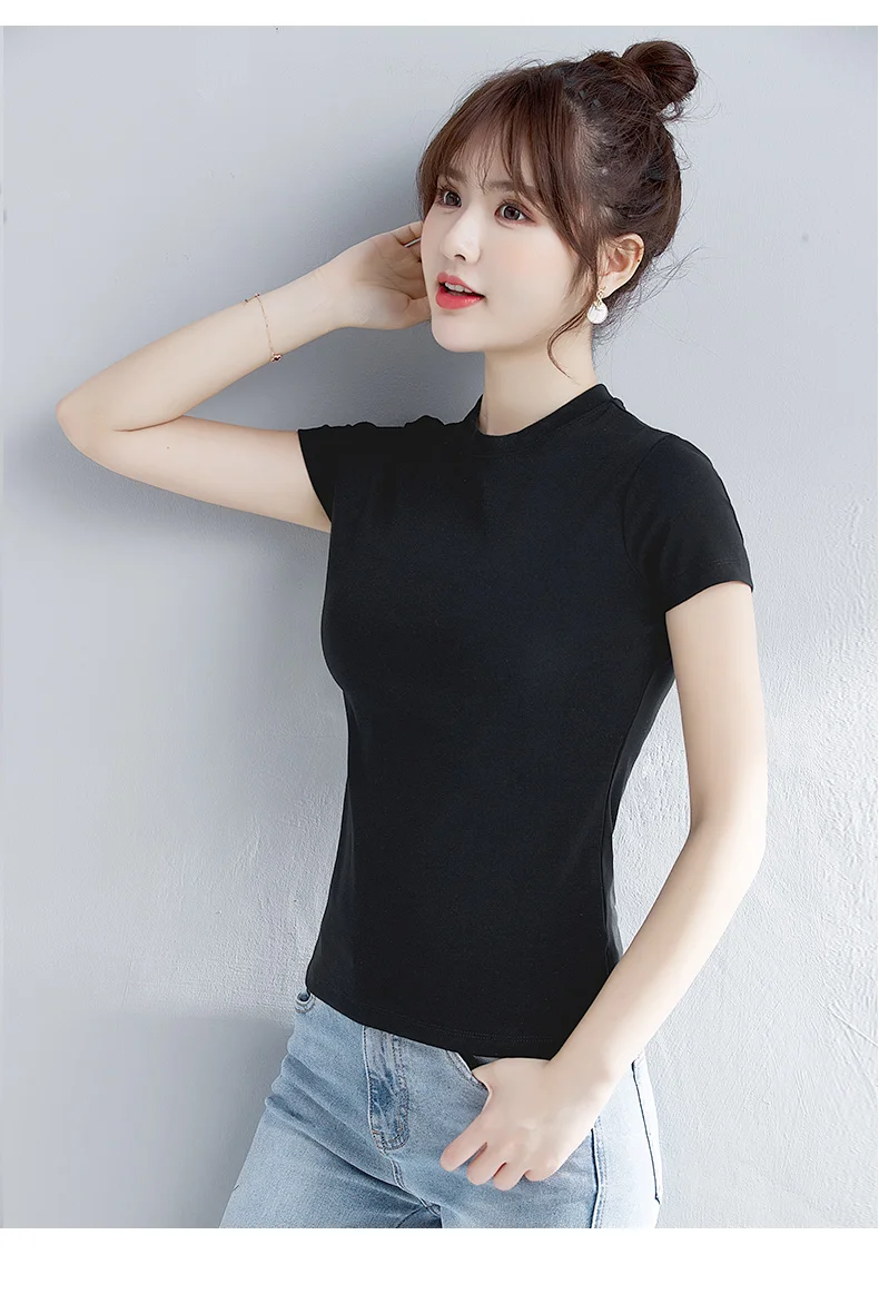 Женская хлопковая Футболка с высоким воротником, однотонная женская футболка с коротким рукавом, Универсальные женские футболки