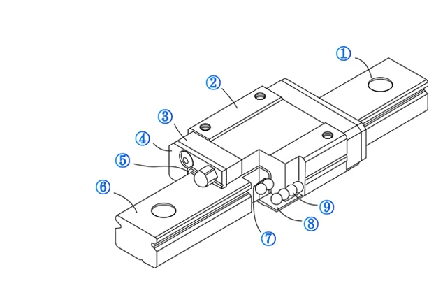 Система смазки: MGN15 оснащена смазочным ниппелем на боковой стороне торцевой крышки, чтобы обеспечить клиентов смазкой, в то время как MGN7/9/12 отверстия для розлива масла защищены на боковой стороне торцевой крышки, который может вбивать масло или смазку в блок скольжения и смазывать.
