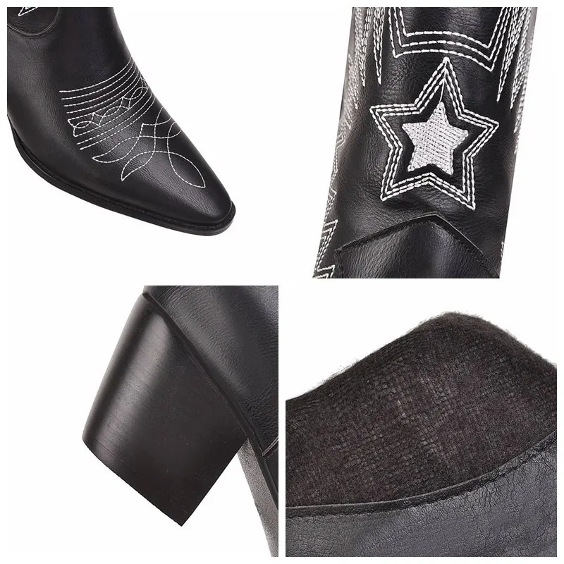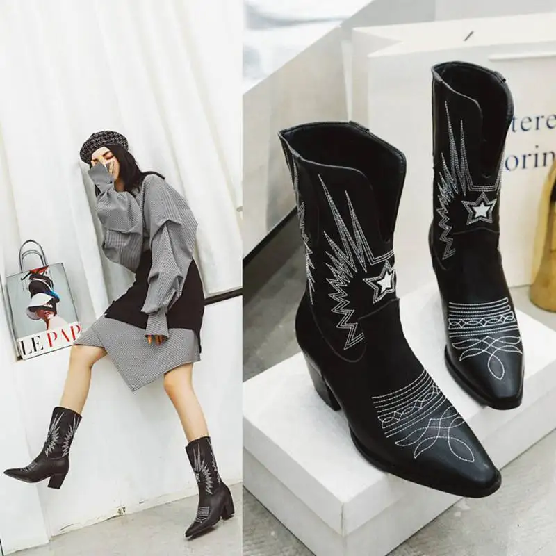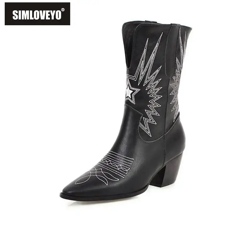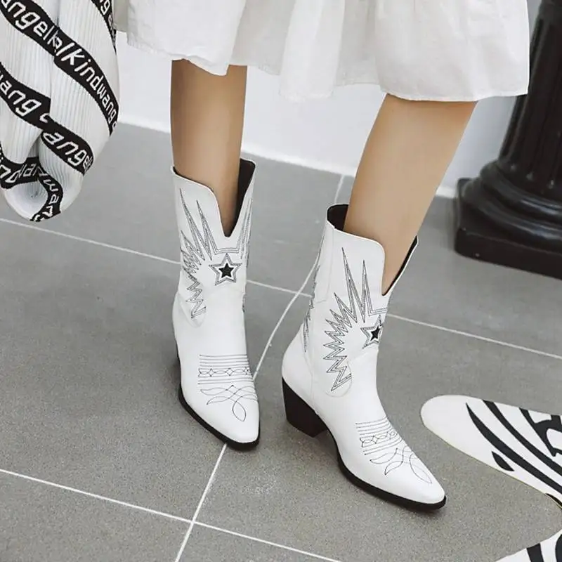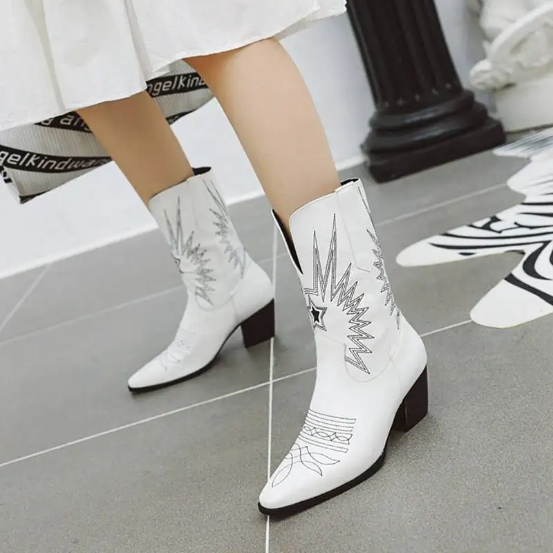 SIMLOVEYOженские ботильоны в ковбойском стиле, с острым носком, на толстом квадратном каблуке, из искусственной кожи, большие размеры 34-48, черный и белый цвета, Повседневная Осенняя обувь