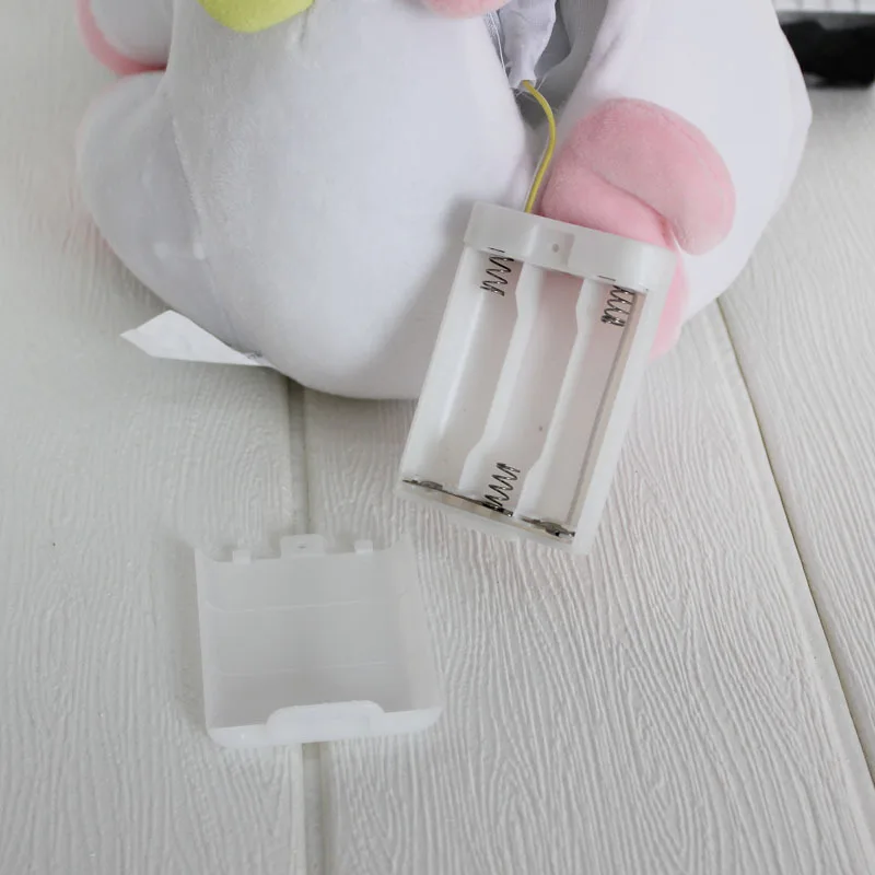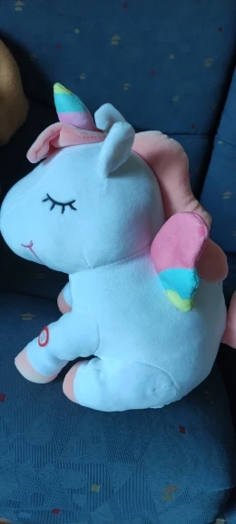 Заказ прибыл в хорошем состоянии, в установленные сроки, продукт имеет липучку на спине, и внутри он поставляется с коробкой, чтобы положить батареи, они 3, И в руке единорога есть кнопка, которая При затягивании включается, плюш очень нежный и очень мягкий тоже.