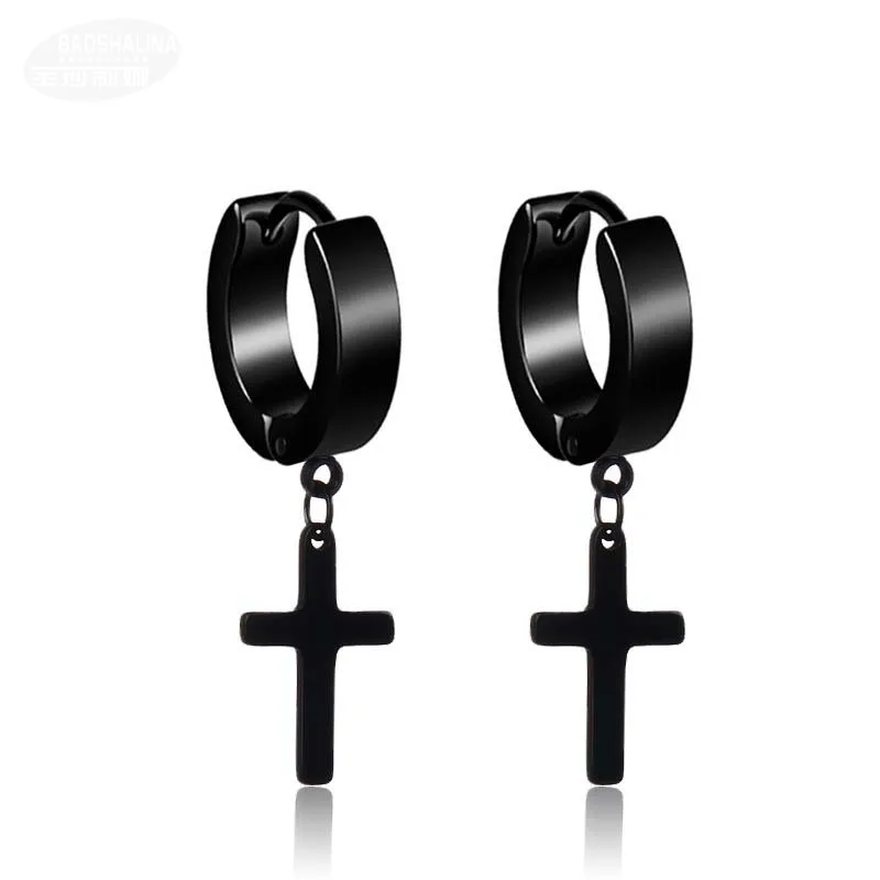 Серьги-кольца женские, мужские, из нержавеющей стали, с черным крестом