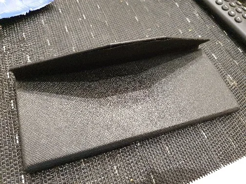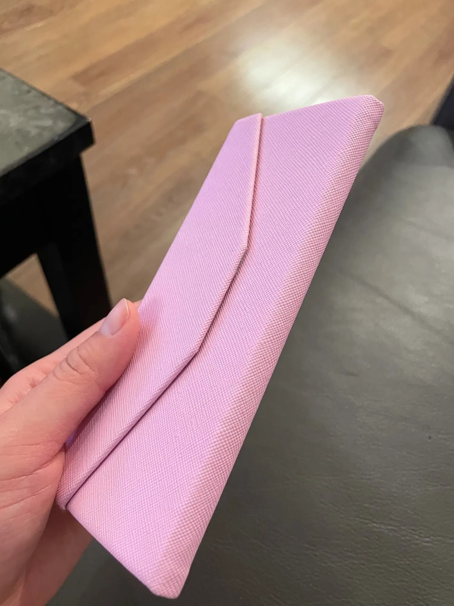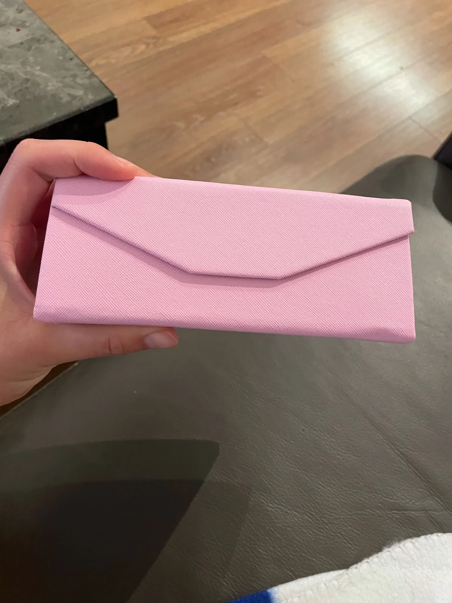 Чехол должен быть жестким, а внутри мягким. А этот такой хлипкий, даже есть ощущение, что если его сильнее сдавить, то он раздавится, сломается. Небезопасно хранить там очки. В сложенном состоянии кривой, места сгиба мятые. На ощупь приятный
