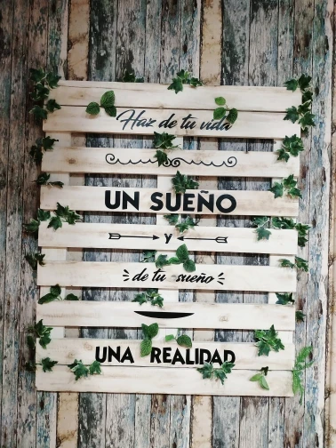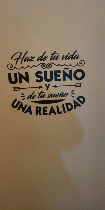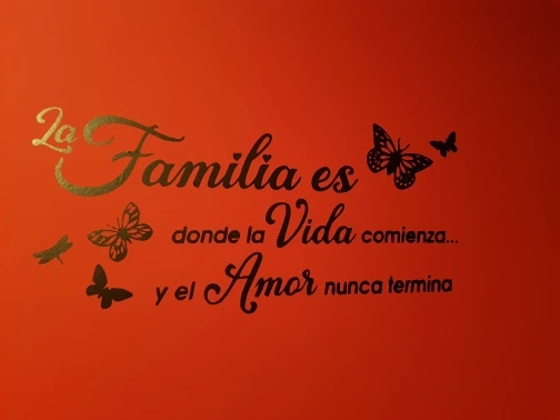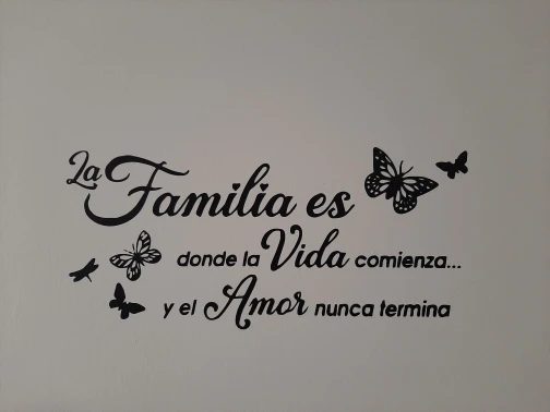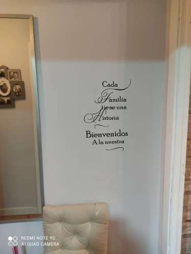 Viene la pegatina toda junta , no puedes jugar con los complementos de la frase , o ponerla a tu gusto. y no se pega con facilidad . No lo recomiendo