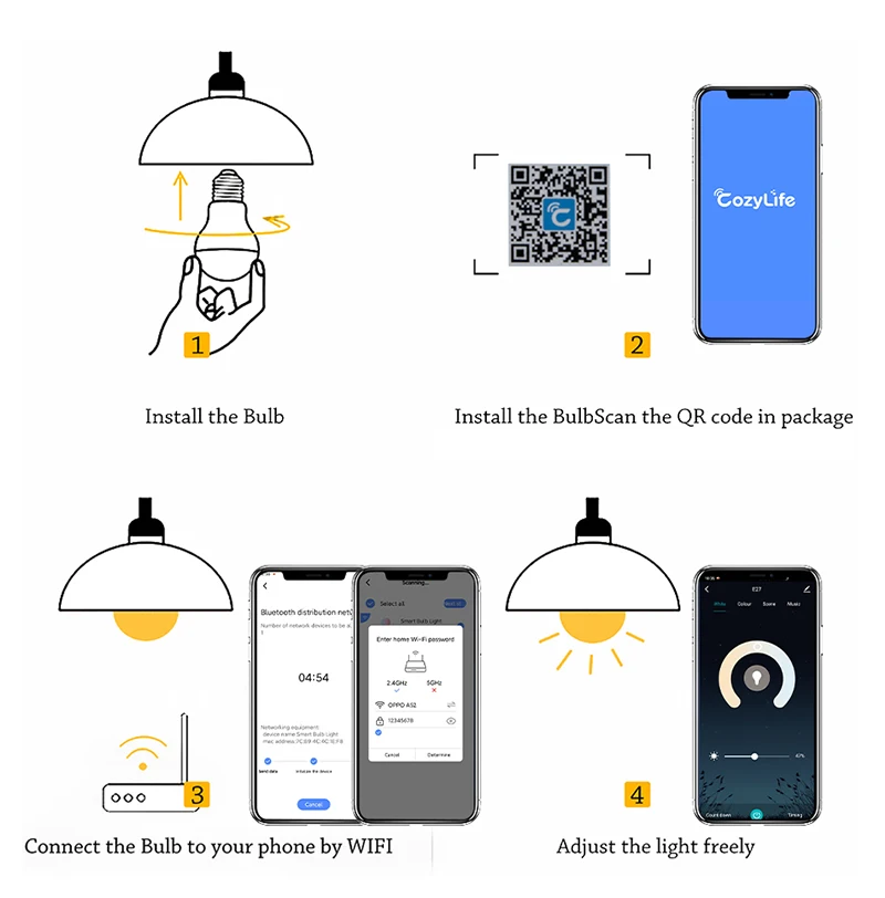 Aby się połączyć przez wifi musiałem zresetować żarówkę i połączyłem z aplikacją w smartfonie. Działa.