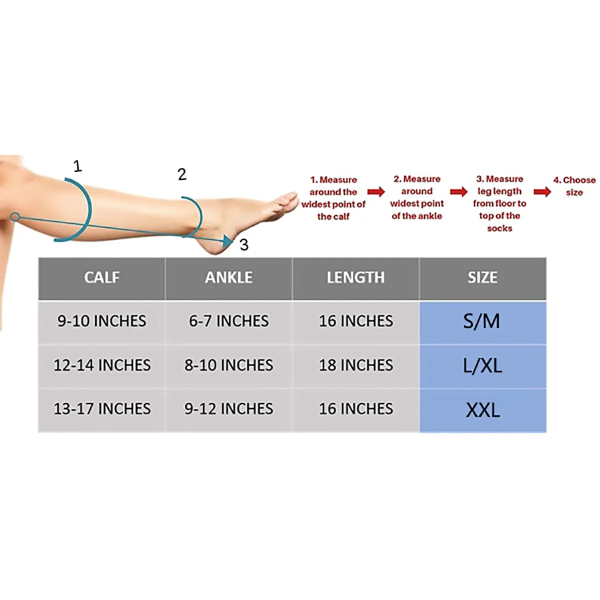 Ткань: нейлоновый Размер икры --- лодыжки ------- длина ------ Размер 9-10 дюймов -- 6-7 дюймов --- 16 дюймов --- S/M 12-14 дюймов -- 8-10 дюймов --- 16 дюймов --- L/XL 13-17 дюймов-9-12 дюймов --- 16 дюймов --- XXL эти Компрессионные носки на молнии просты в использовании и помогут успокоить и оживить ваши ноги, возвращаем Вам воодушевление на своем шаге! Стоя весь день, вы можете вызвать боль в ногах и ступнях, но эти Компрессионные носки на молнии облегчают эту боль, усиливая кровообращение, мгновенно облегчая даже самую страшную боль и отеки! Дизайн без мыска подходит для стопы любого размера, а устойчивая к защемлению молния позволяет легко надевать и снимать эти носки. Эти компрессионные чулки изготовлены из дышащего нейлона, смеси спандекса, что позволяет носить их с любым типом обуви. Нюдовый цвет хорошо сочетается с большинством оттенков кожи, так что никто даже не узнает, что вы их носите! Удобная конструкция прекрасно подходит для длительных поездок и помогает снять отеки и удержание жидкости! Дни страданий с отеком ног и болезненным варикозным расширением вен закончились. Теперь вы можете помочь вам снять симптомы целый день, каждый день. Просто снимите боль с помощью компрессионных носков на молнии!
