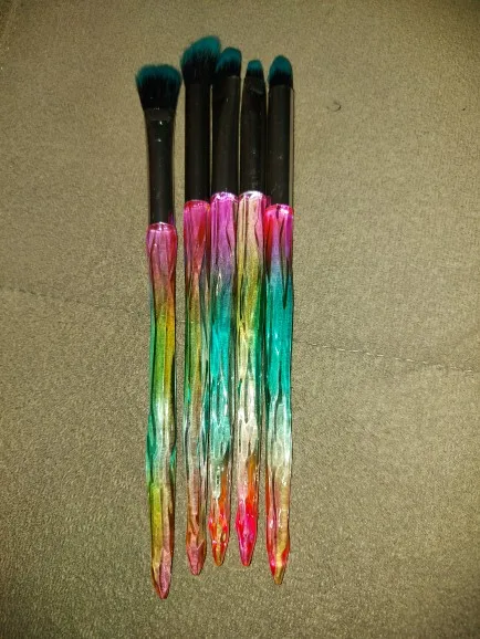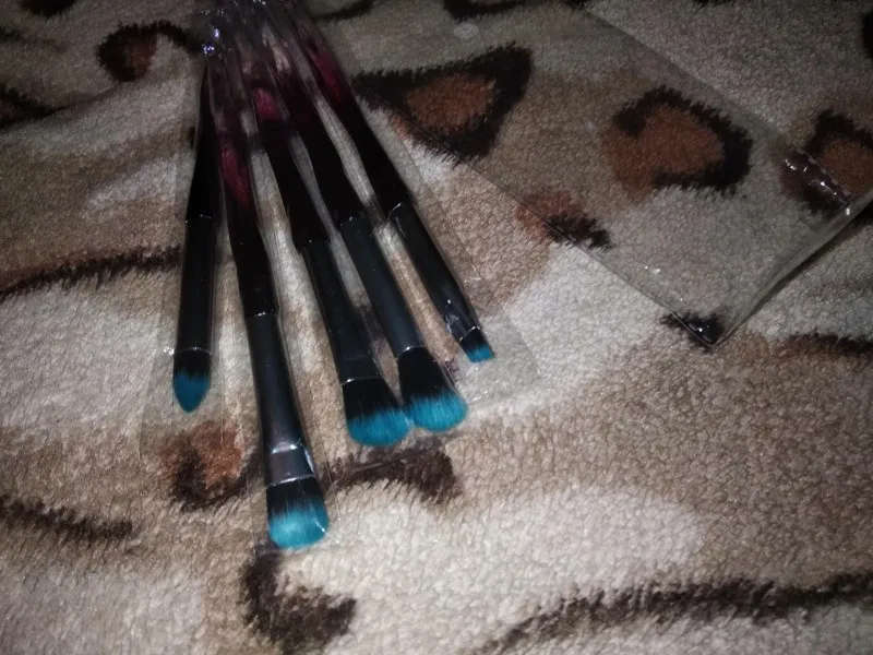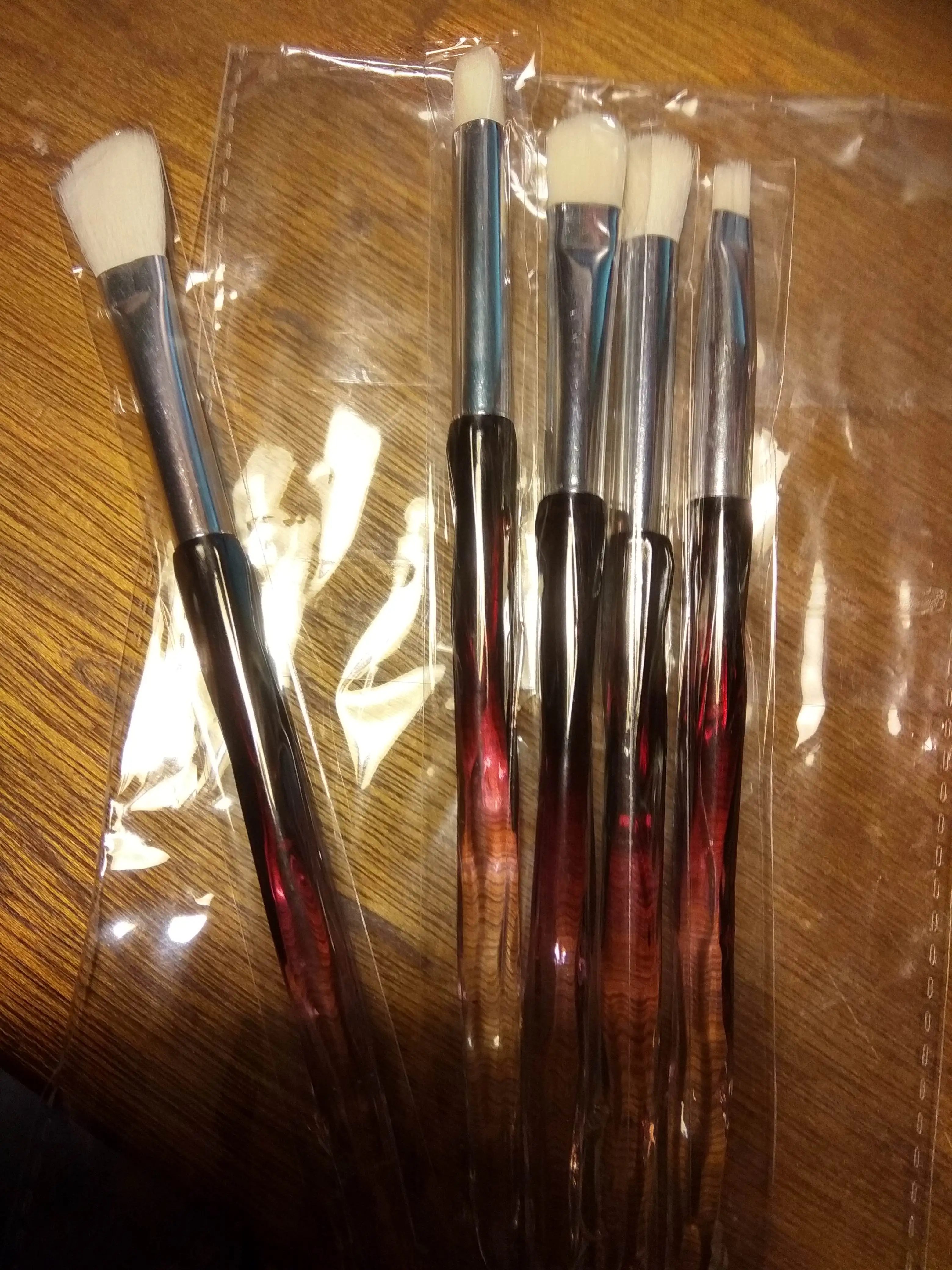 Кисти шли ровно месяц. Упаковано неплохо. Ворс очень гладкий и упругий, приятный к коже, на последнем фото видно, что цвет ворса у 3 кистей отличается, но мне не принципиально. Очень красиво переливаются. Вобщем-то все. В целом я всем довольна.