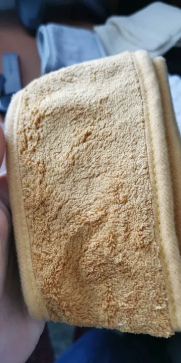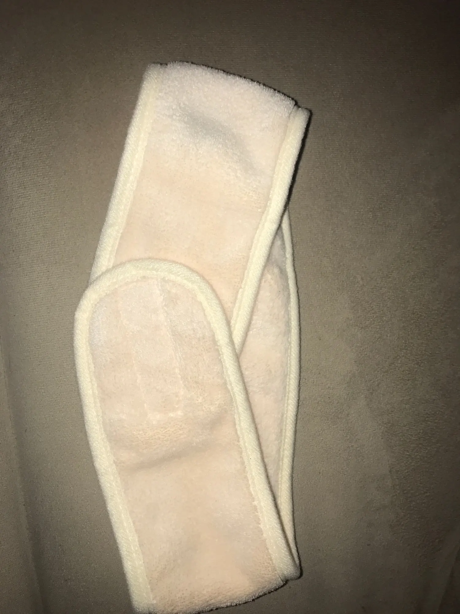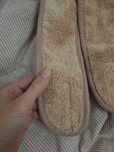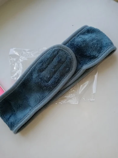 немного лезет ворс, запах есть небольшой, при стирке красится очень сильно, но для ухода за лицом просто идеальна. широкая, держится на волосах, не сползает. покупкой довольна
