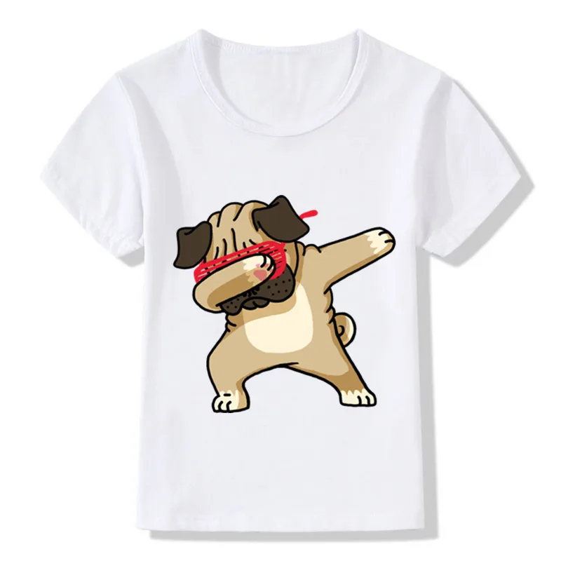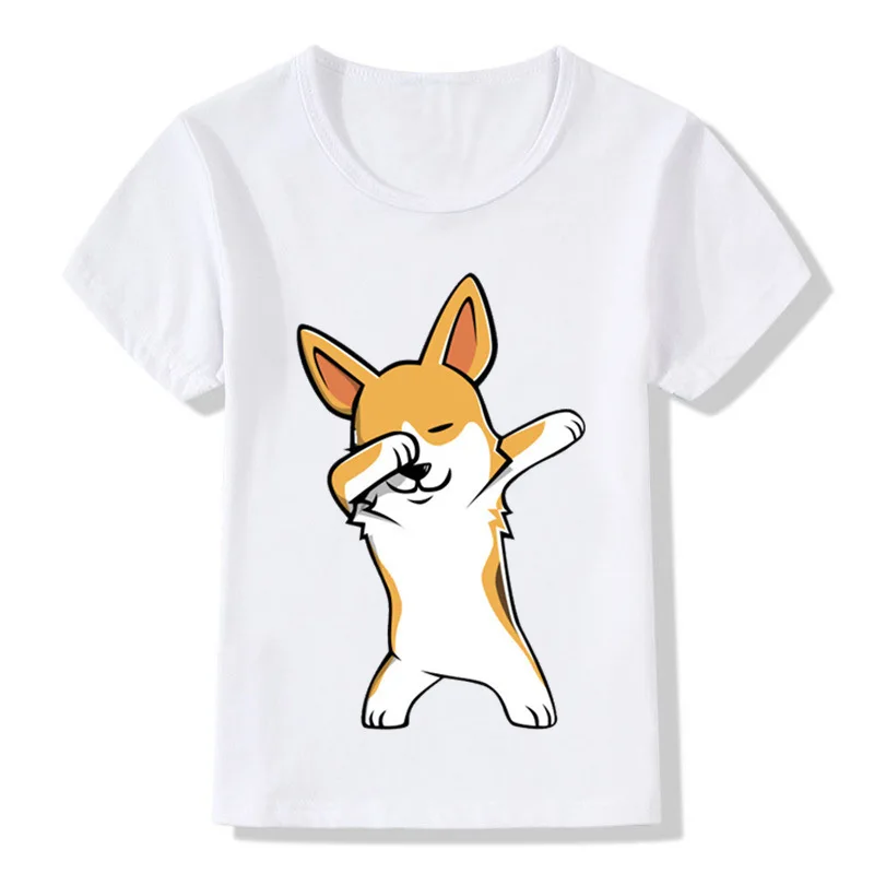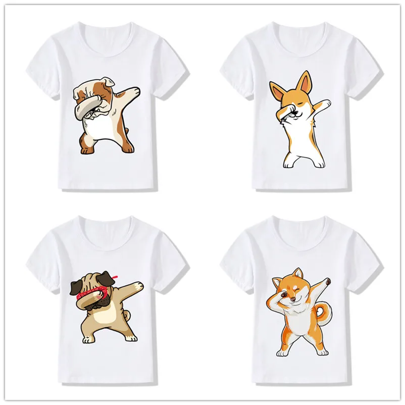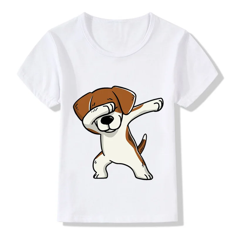 Забавная детская одежда, мультяшная футболка, детская одежда с принтом танцевальной собаки, белые топы с круглым вырезом и коротким рукавом, футболка для девочек и мальчиков, bal066