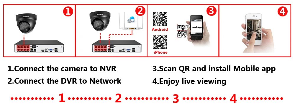 Простая настройка, всего 4 шага для просмотра на мобильный телефон,Просмотр видео в режиме реального времени в системе из любого места и в любое время с помощью смартфона, стола или ПК с передовой технологией P2P, вы можете получить удаленный доступ к вашей системе в течение нескольких минут или меньше, нет необходимости в переадресации, удаленный доступ никогда не был таким простым!