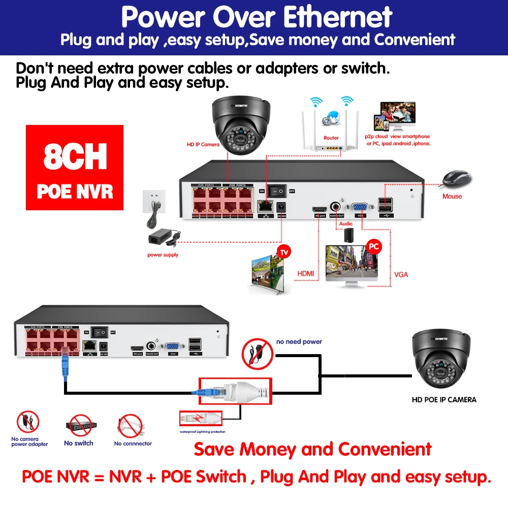 Нет дополнительных кабелей питания или адаптеров, просто подключив ip-камеру к NVR с помощью одного кабеля, вы можете легко завершить установку без знания о компьютере или сети и начать наслаждаться супер простым мониторингом среди вашего смартфона, планшета или ПК.