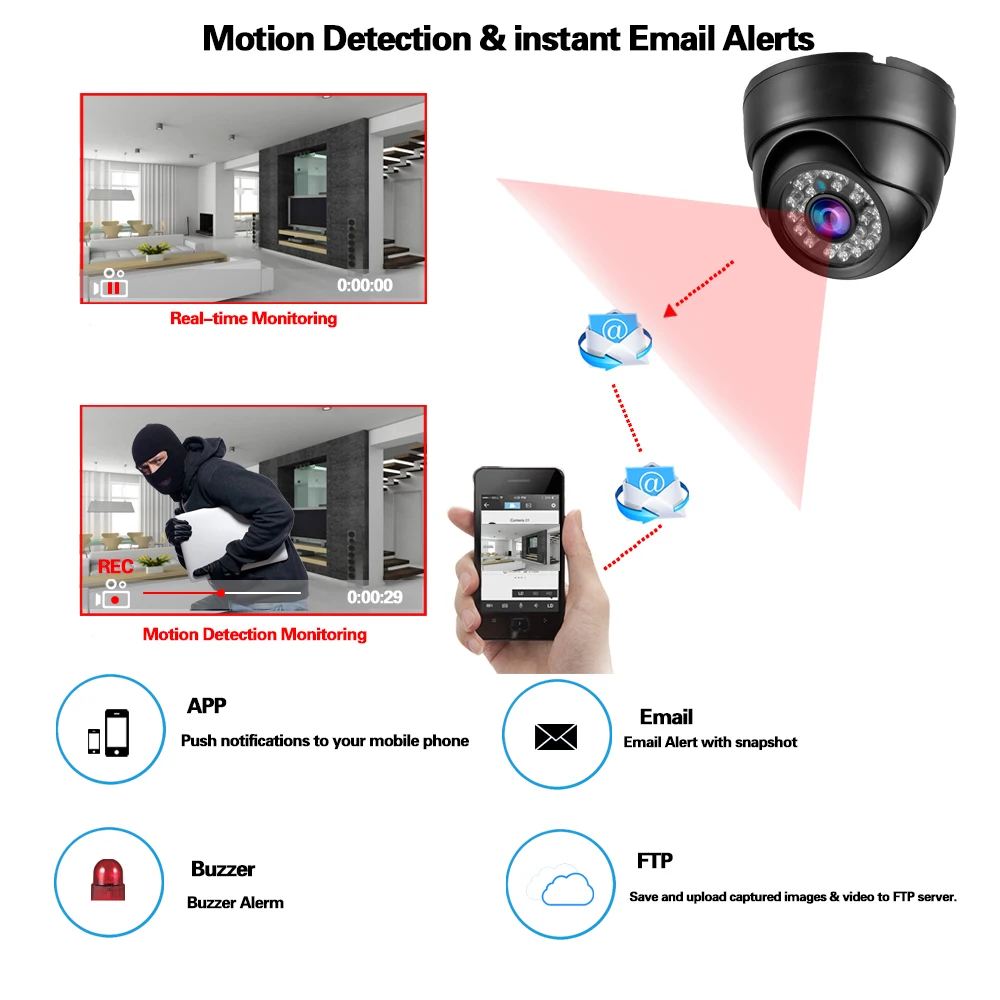 * Оповещение по электронной почте и оповещение о тревоге. Когда срабатывает обнаружение движения, NVR автоматически отправляет звуковой сигнал и уведомления о тревоге на вашу электронную почту, включая снимок на месте;