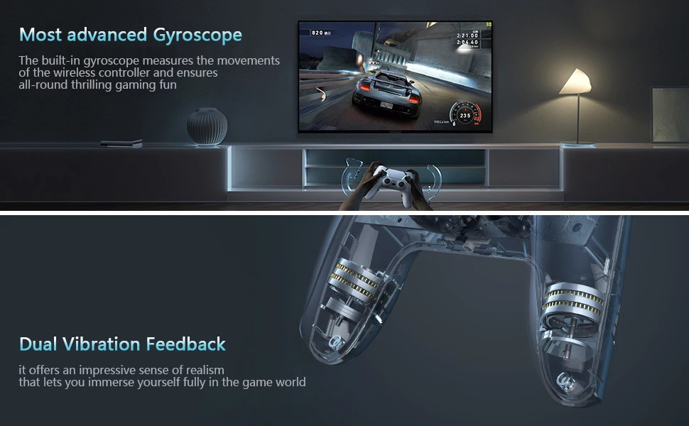 Встроенный акселерометр и встроенный гироскоп: Высокочувствительный встроенный акселерометр и встроенный гироскоп измеряют движения нашего игрового контроллера и обеспечивают всестороннее захватывающее удовольствие.