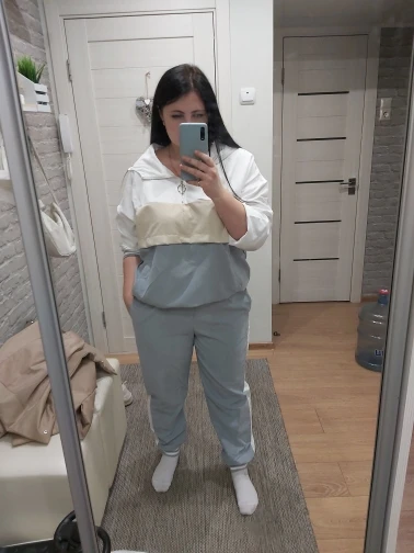 Костюм очень классный! Советую! Я,конечно, расстроилась из -за размера(мои параметры 94/74/104. В итоге верх супер, в талии и бёдрах свободно, но обтянуло ляшки так, что в штанах не возможно сесть))) думаю размер больше не решил бы проблему, так как тогда бы в животе был бы пузырь ещё больше.