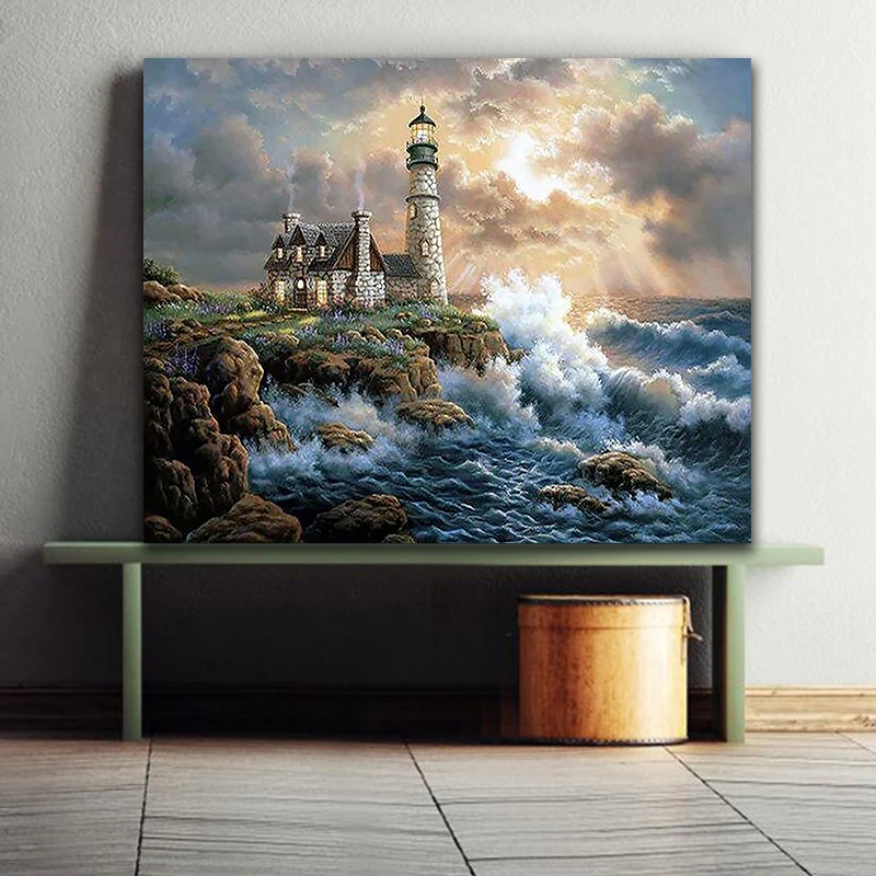DIY картинки для раскраски по номерам с цветами Морской Маяк ночного вида, картина для рисования по номерам, дом в рамке