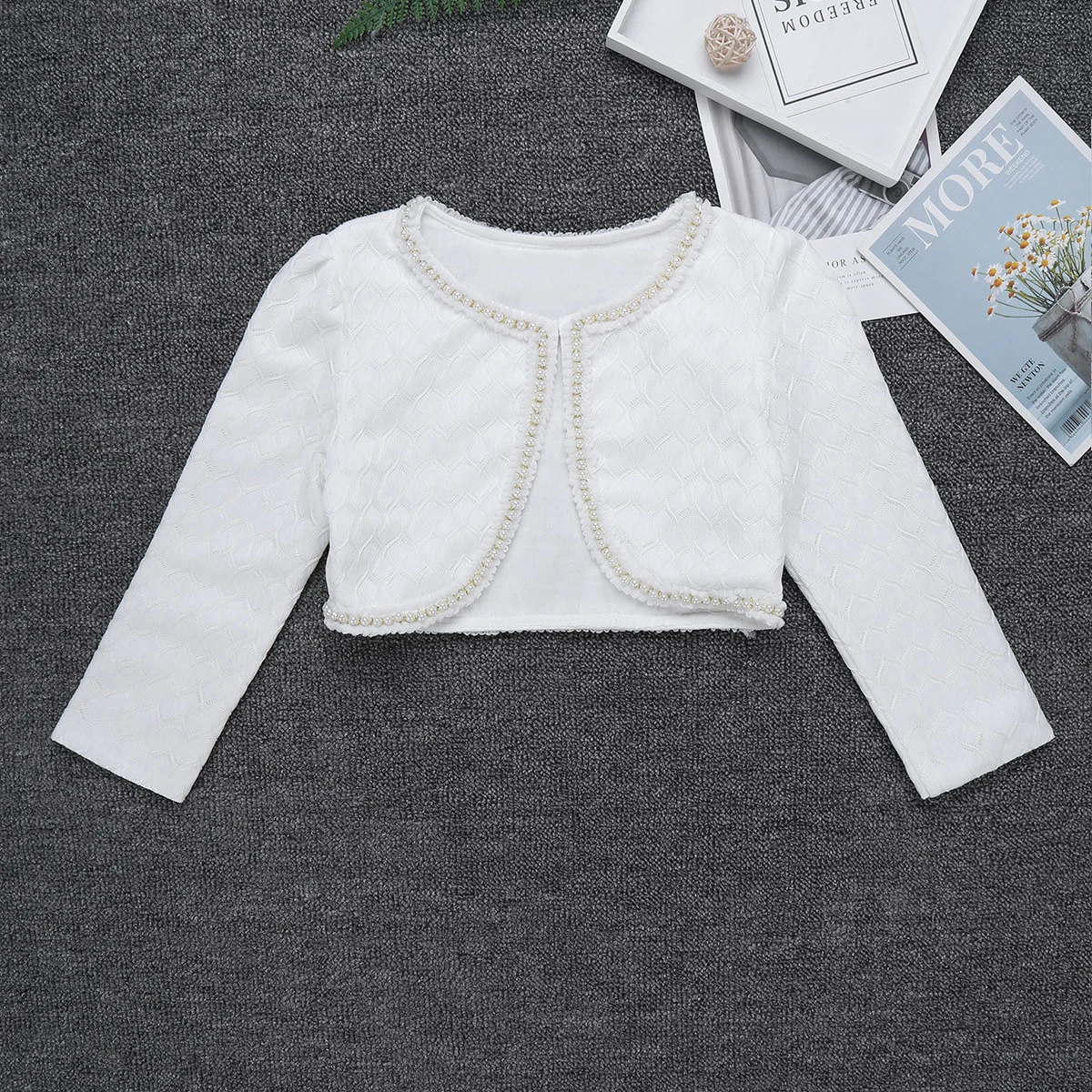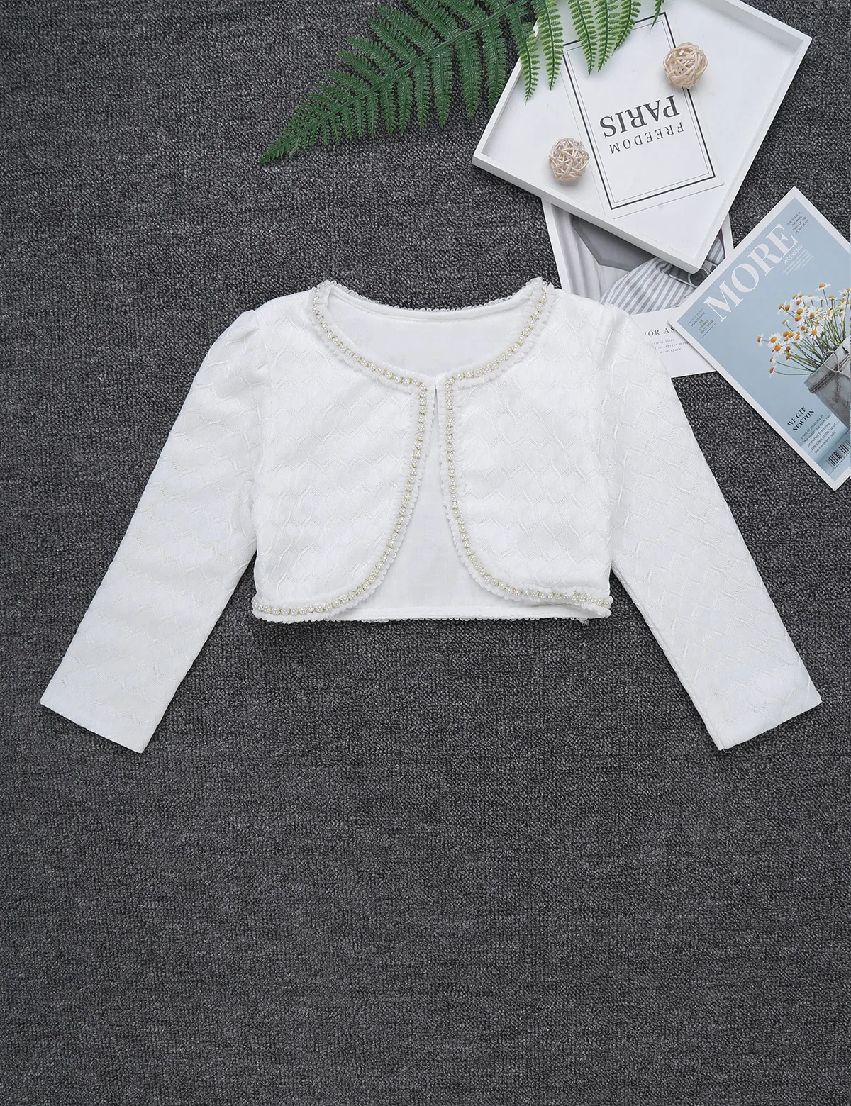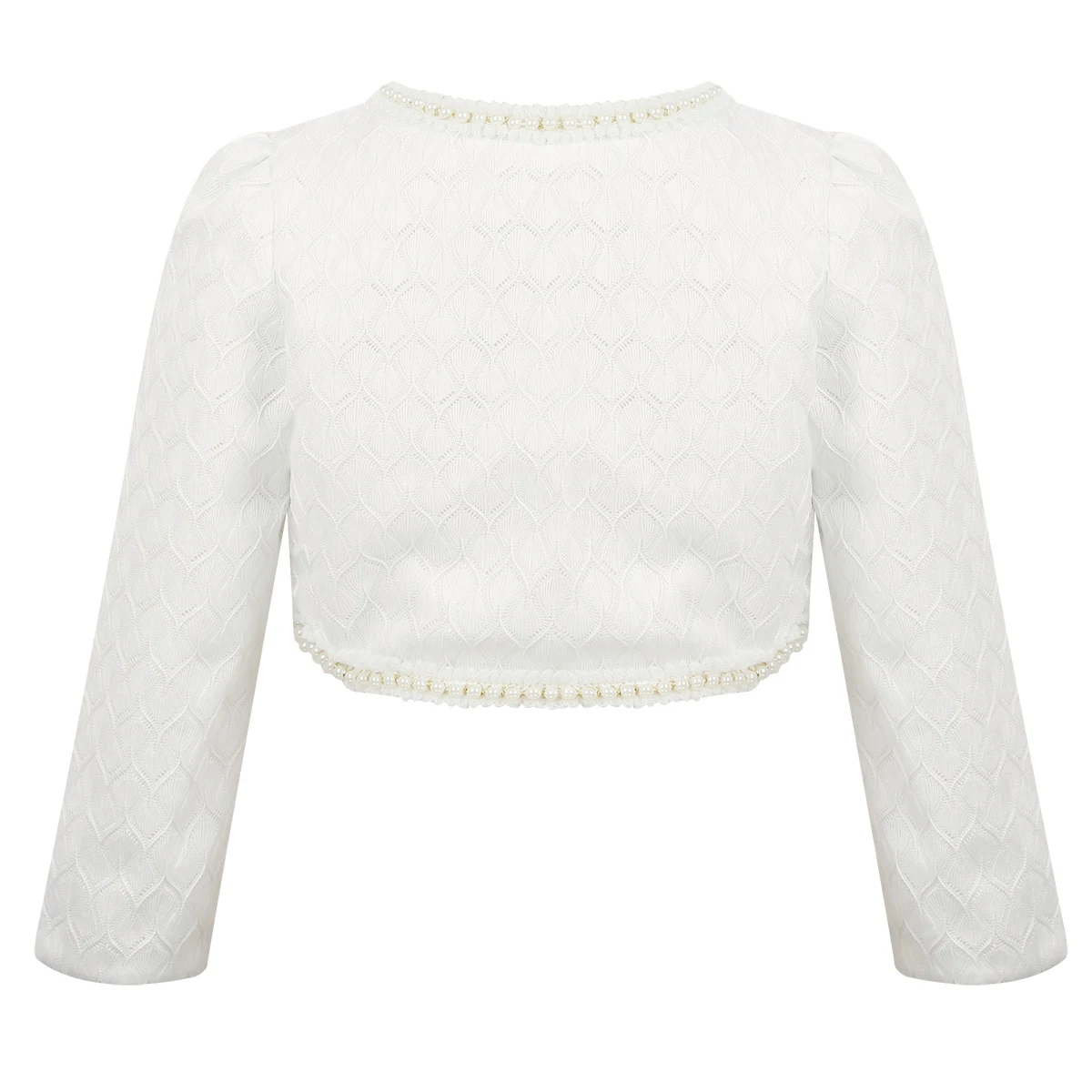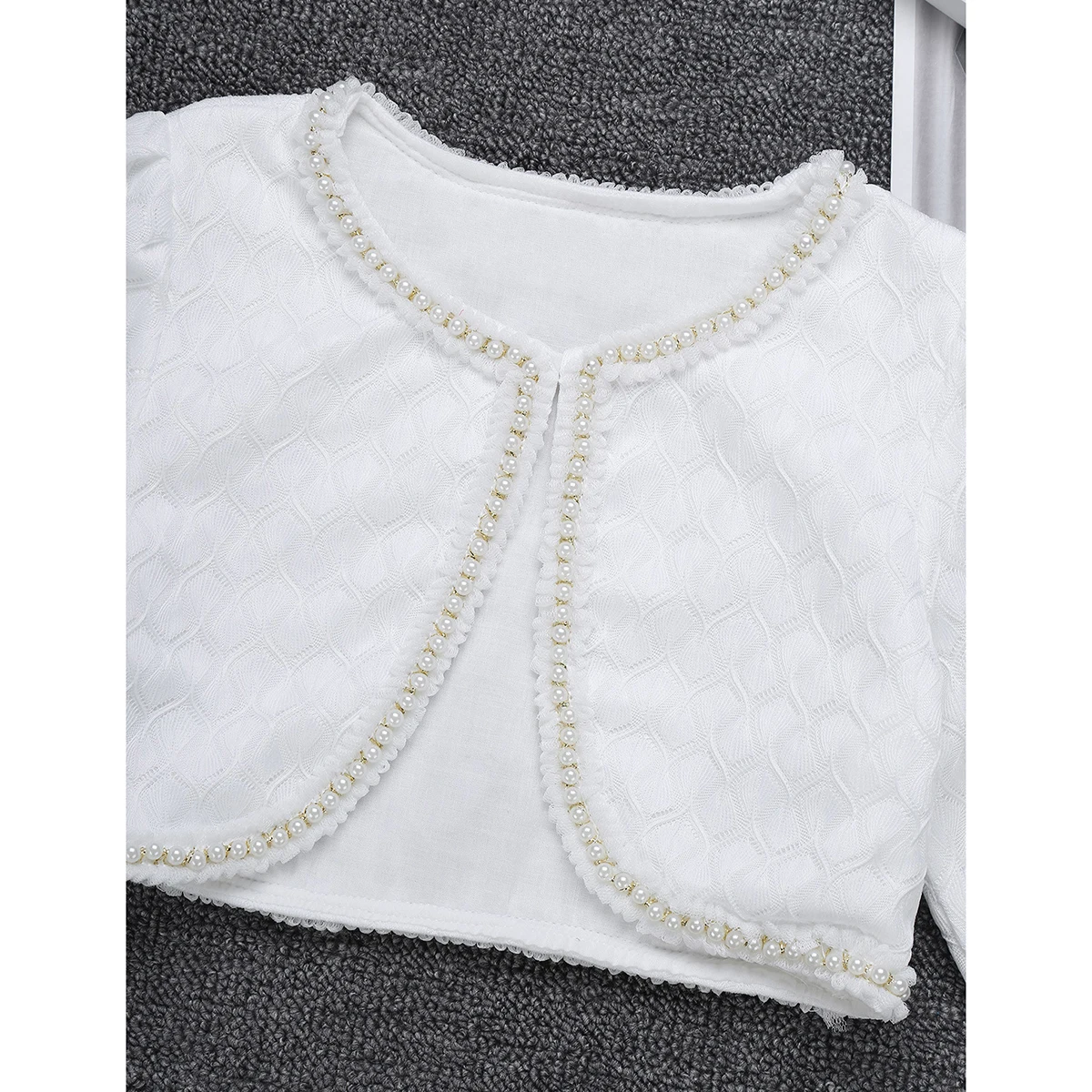 Особенности: Плечики изготовлены из полиэстера и кружевного материала, советуют ручную стирку. Таблица размеров означает возрастные диапазоны для девочек, но они предназначены только для общего руководства. Длинные рукава, круглый вырез горловины с застежкой на одну пуговицу. Изделие декорировано отделкой из искусственного жемчуга. Легкий, стильный и элегантный дизайн, который придает эксклюзивный вид с платьем без рукавов. Подходит вечерние, свадьбы, дня рождения или повседневной носки.