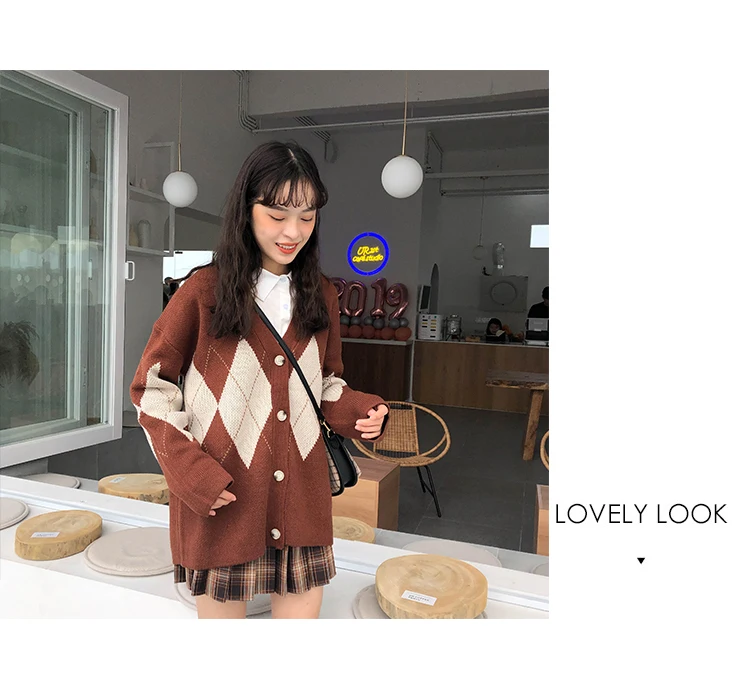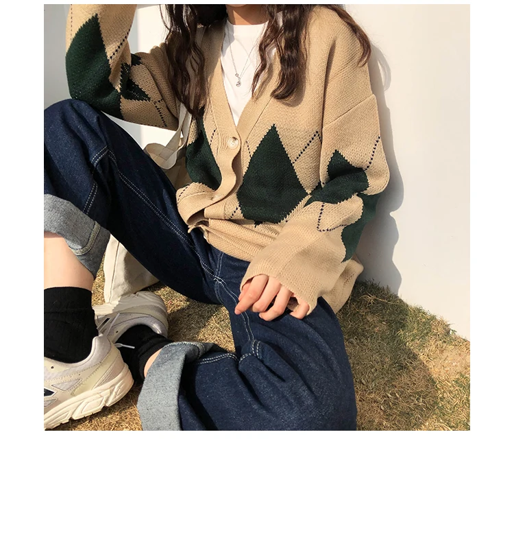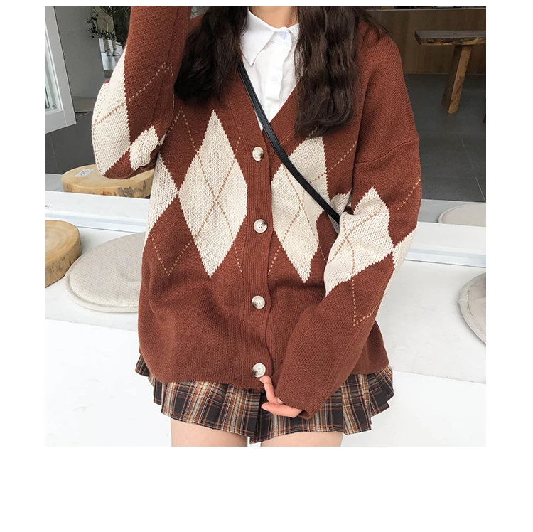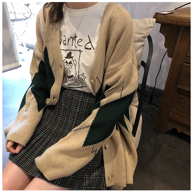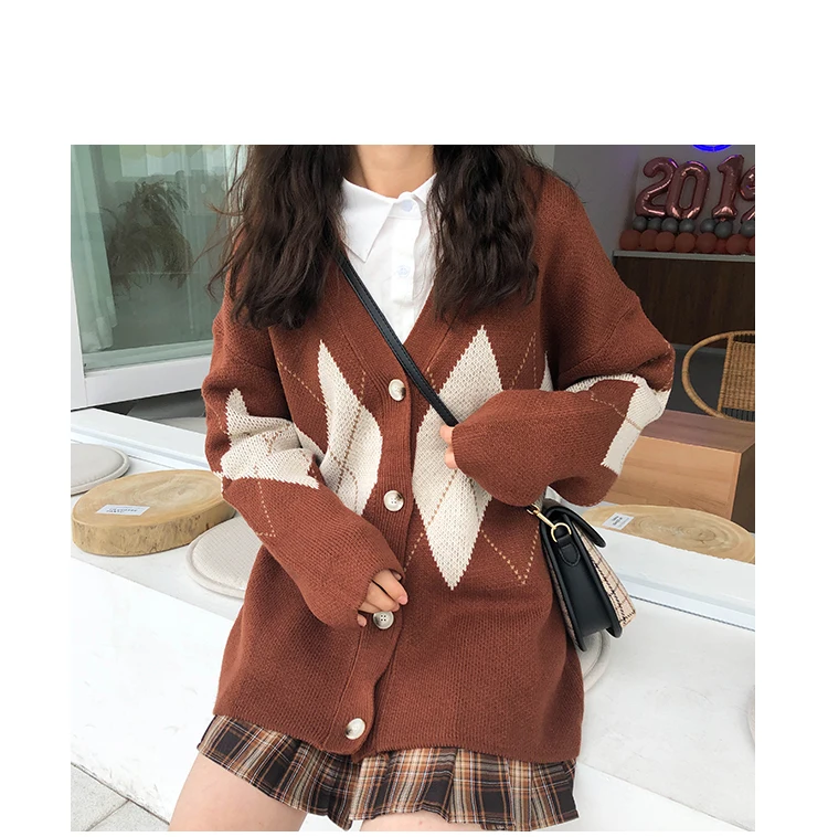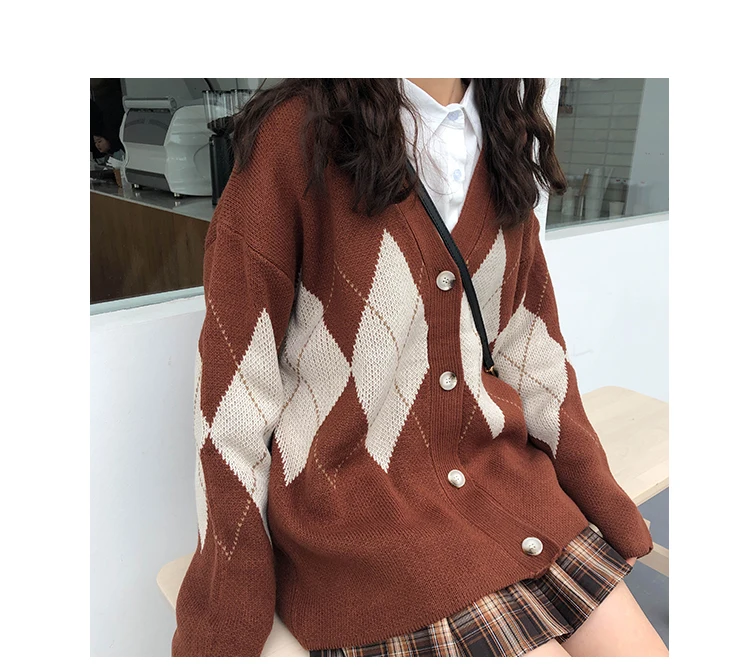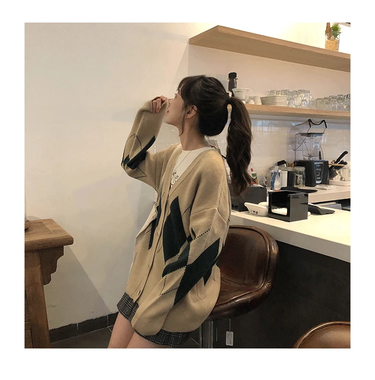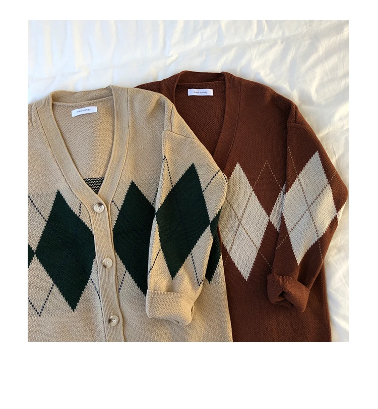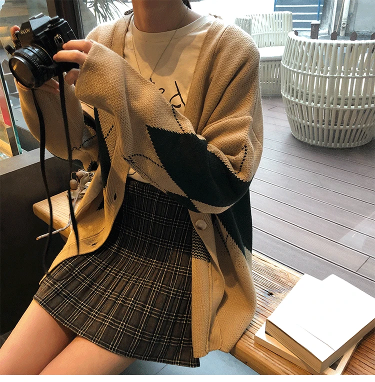 Свитер женский в клетку, однобортный Свободный Повседневный Кардиган в стиле оверсайз с пышными рукавами, кардиганы с v-образным вырезом, Осень-зима