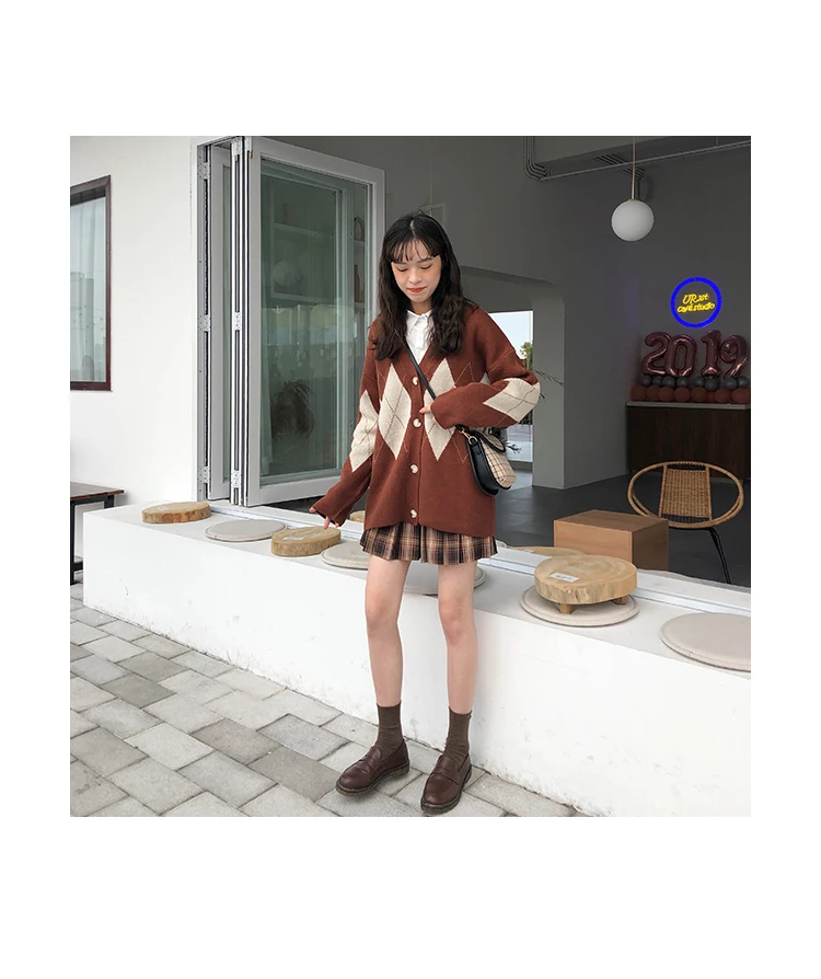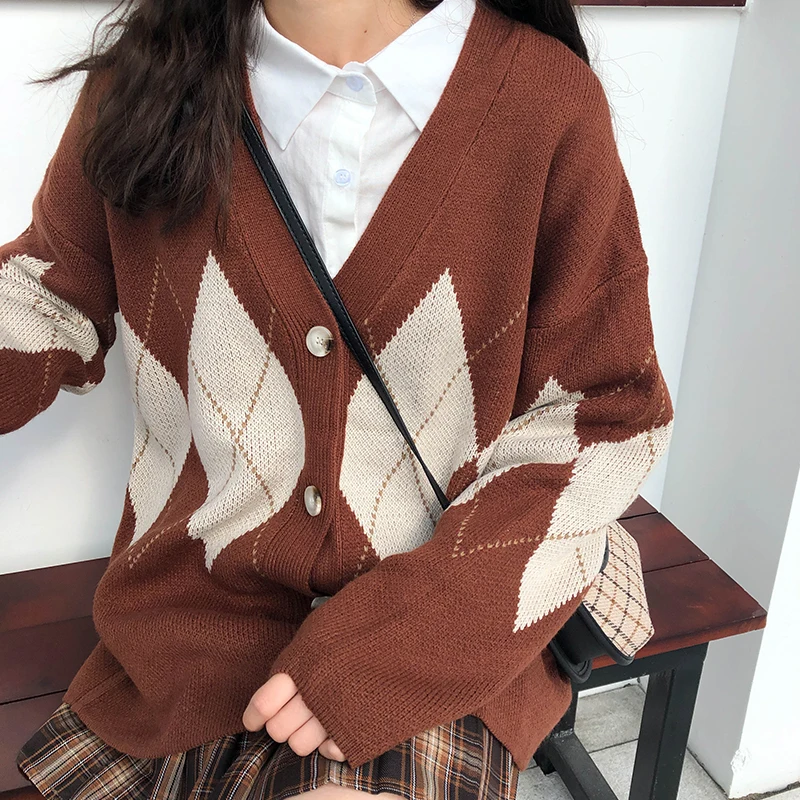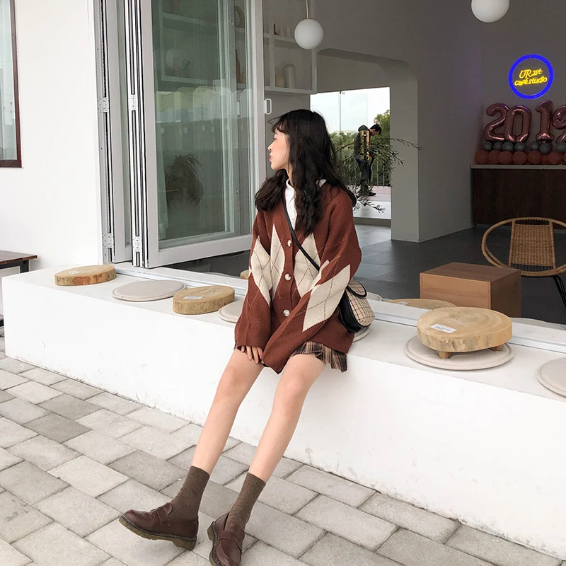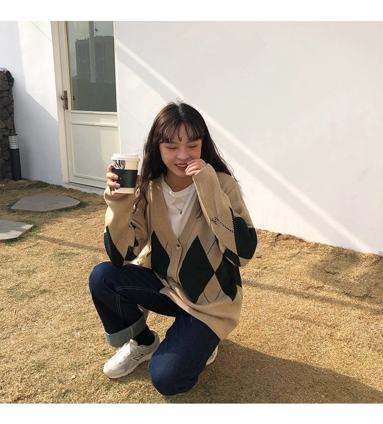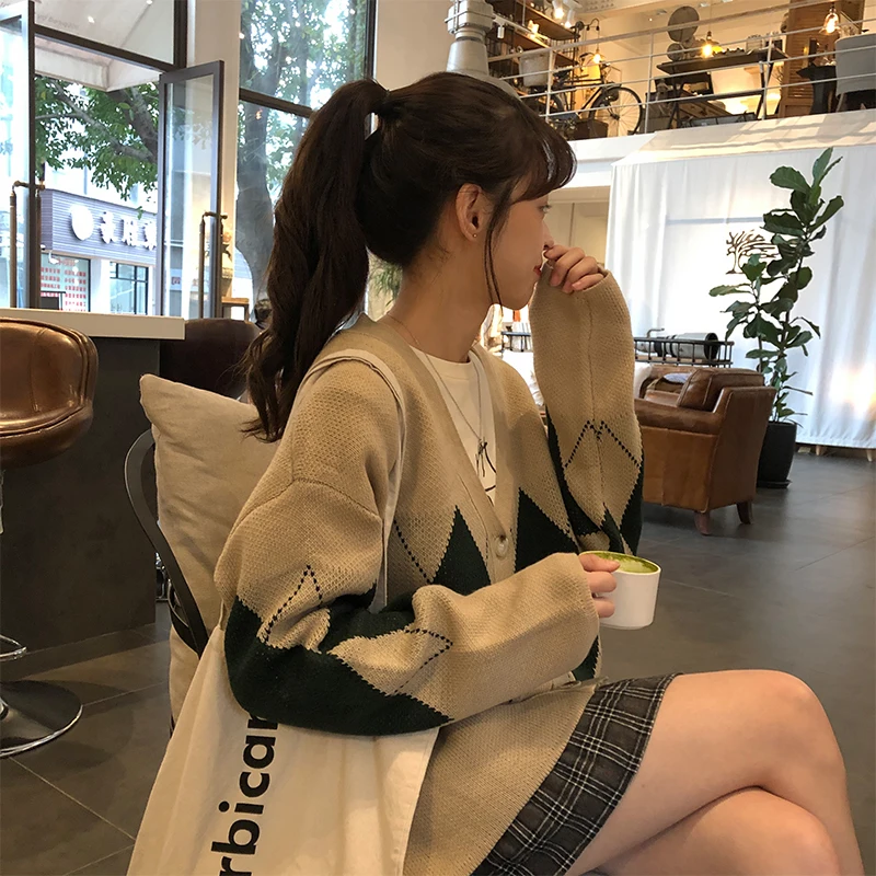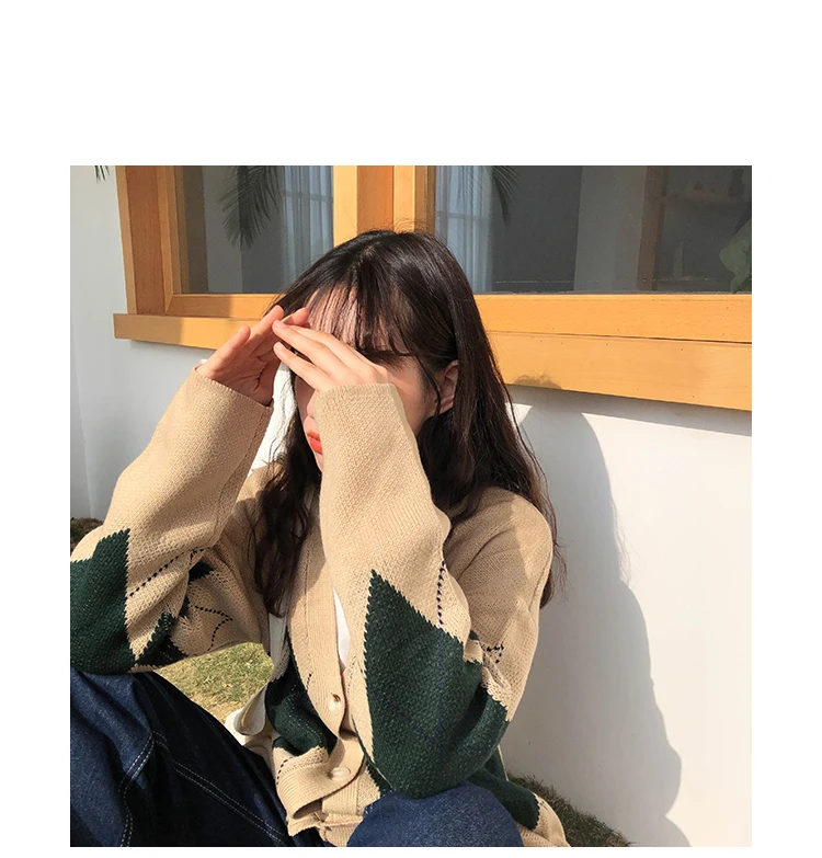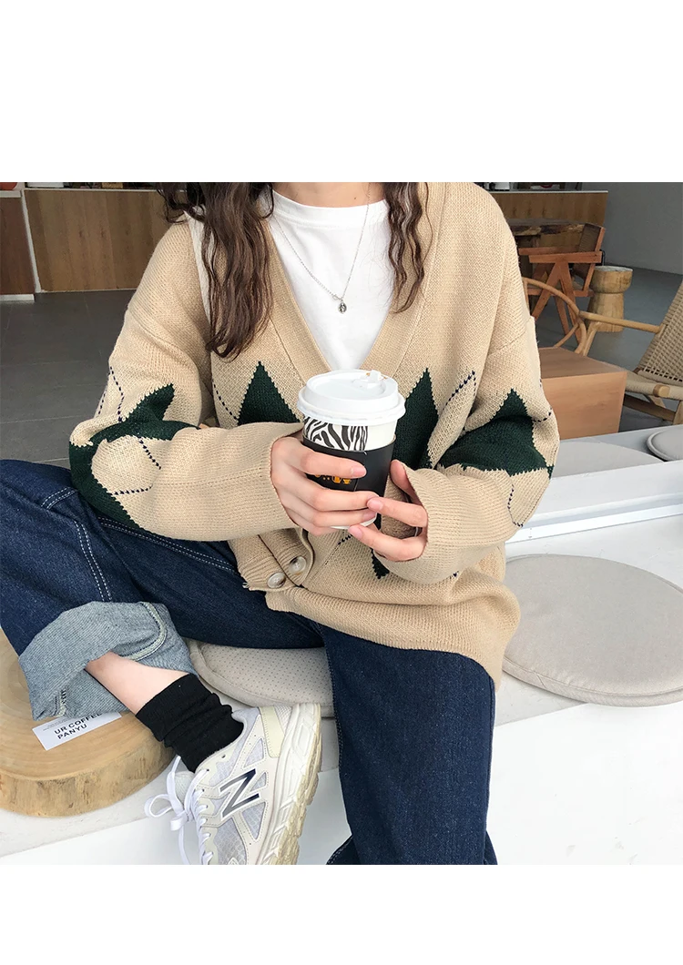 Свитер женский в клетку, однобортный Свободный Повседневный Кардиган в стиле оверсайз с пышными рукавами, кардиганы с v-образным вырезом, Осень-зима