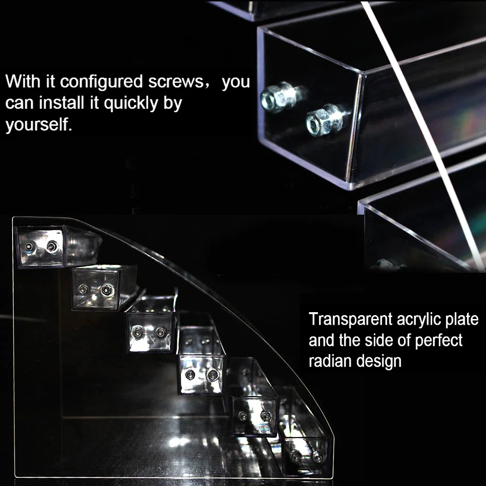Прозрачный акриловый косметический Органайзер для хранения лака для ногтей Характеристики: Изготовлен из высококачественного акрилового материала, который является безопасным, нетоксичным, экологичным и прочным для долгосрочного использования. Идеально подходит для тату-чернил, лака для ногтей и других вещей для организации и отображения. Слои лестницы дизайн может быть лучше, чтобы показать ваш лак для ногтей и другие вещи. С помощью настраиваемых винтов вы можете установить его быстро и удобно самостоятельно. Прозрачная Пластина и сторона идеального дизайна radian, что делает ее красивой и модной. Тип: стойка для лака для ногтей Материал: акриловая пластина + пластик + металлические детали Дополнительные типы: два слоя, три слоя, четыре слоя, пять слоев, шесть слоев, семь слоев (по желанию) Особенности: прозрачный, легкий, прочный, многослойный Решетки Ширина: 3,5 см/1,38 "(прибл.) Глубина решетки: 3 см/1,26 "(прибл.) Два слоя Размеры: Длина: 31 см/12,20 ", Ширина: 9 см/3,54", высота: 7,5 см/2,95 "(прибл.) Три слоя Размеры: Длина: 31 см/12,20 ", Ширина: 13,3 см/5,24", высота каблука: 11 см/4,33 "(прибл.) Четыре слоя Размер: Длина: 31 см/12,20 ", ширина: 18 см/7,09", высота: 14 см/5,51 "(прибл.) Размер в пять слоев: длина: 31 см/12,20 дюйма, ширина: 22,3 см/8,78 дюйма, высота: 17 см/6,69 дюйма (прибл.) Шесть слоев Размеры: Длина: 31 см/12,20 ", Ширина: 26,5 см/10,43", высота: 21,4 см/8,43 "(прибл.) Размер семи слоев: длина: 31 см/12,20 дюйма, ширина: 31 см/12,20 дюйма, высота: 25 см/9,84 дюйма (прибл.) Примечания: Благодаря светильник и экрана Цвет Товара может быть s светильник ly отличается из-за характеристик монитора компьютера. Возможны незначительные отклонения в размерах из-за различных измерений вручную. Посылка включает в себя: 1 x стойка для лака для ногтей (винты в комплекте)