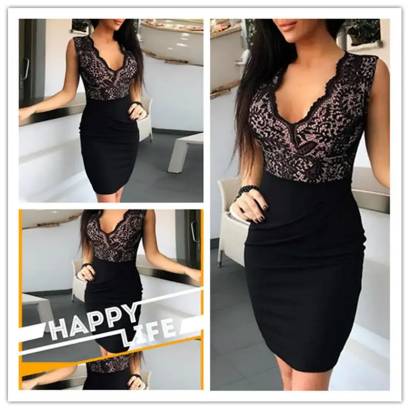 Женское летнее сексуальное кружевное короткое мини-платье без рукавов с V-образным вырезом облегающее Вечерние вечернее платье