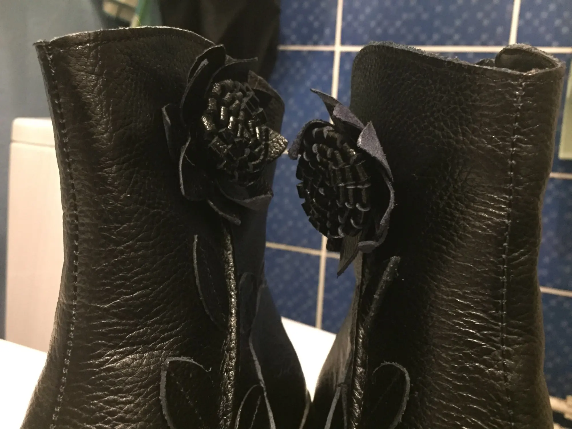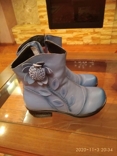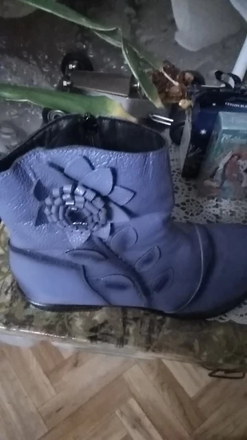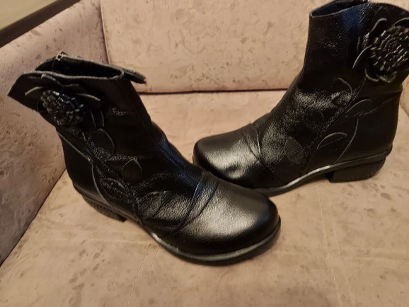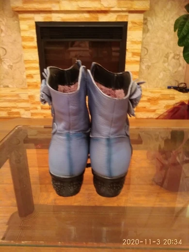 При длине стопы 25,7 см и ширине 9см , сапожки сели на ногу идеально, можно одеть не очень толстый носок. Несмотря на большой размер смотрятся очень аккуратно на ноге. Внутри короткий мех и меховая стелька. Хризантема смотрится вообще шикарно. У нас, в маленьком городке мне предлагали только лыжи 43 размера или боты, прощай молодость. Я уже покупала обувь такого качества. 2 года, если помыть и кремом намазать, то как только что из магазина. Даже незнакомые спрашивают где я такую обувь беру. Смотрится нестандартно и оригинально. Но главное, что в этой обуви, как в тапочках, удобно и комфортно. На широкую ногу. Цвет чуть более голубой, чем на фото продавца. Хорошо подойдет под джинсу. Ожидаемый недостаток, это запах свежего клея, который очень быстро исчезает. С момента отправки, приехали быстро. Продавец сказочник, по нашей переписке можно сантабарбару снимать, но ответственный, все держит под контролем и всегда отвечает. Рекомендую и продавца и модель. Берите, не пожалеете.