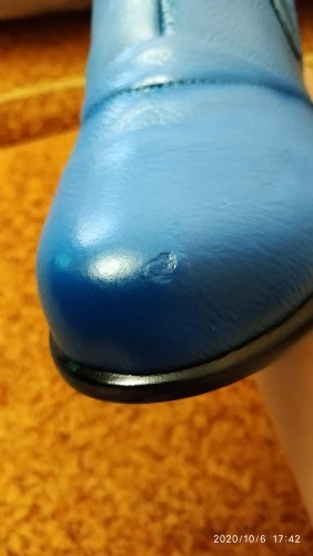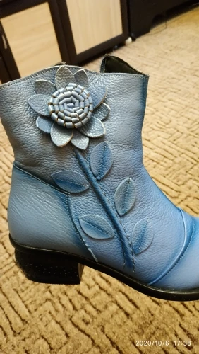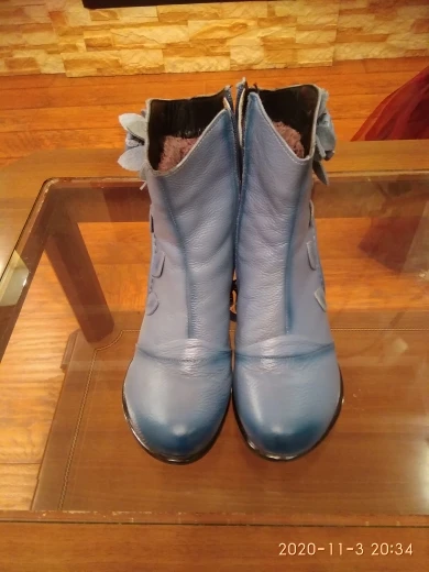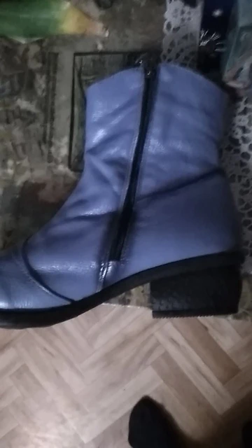 Ботинки мягкие, удобные. Каблук даже не ощущается, хотя он как будто пустой внутри, увидим на сколько хватит. Цвет голубой, ни какого серого оттенка. Молния заедала, поправили в обувной мастерской. Похоже это у них болезнь, читала в других отзывах. Но покупкой я осталась довольна. Яркие, броские, выделяющиеся.