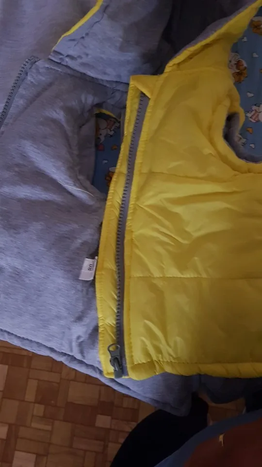 крутая жилетка. сверху гладкий материал, с обратной стороны хлопок. достаточно воздушная. не знаю будет ли промокать если под дождь попасть. взяла с большим запасом с расчетом, что не на один сезон. у нас рост 68, вес 8 кг. есть ограничитель молнии подбородка.