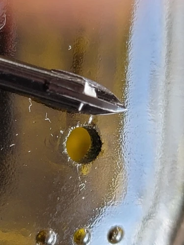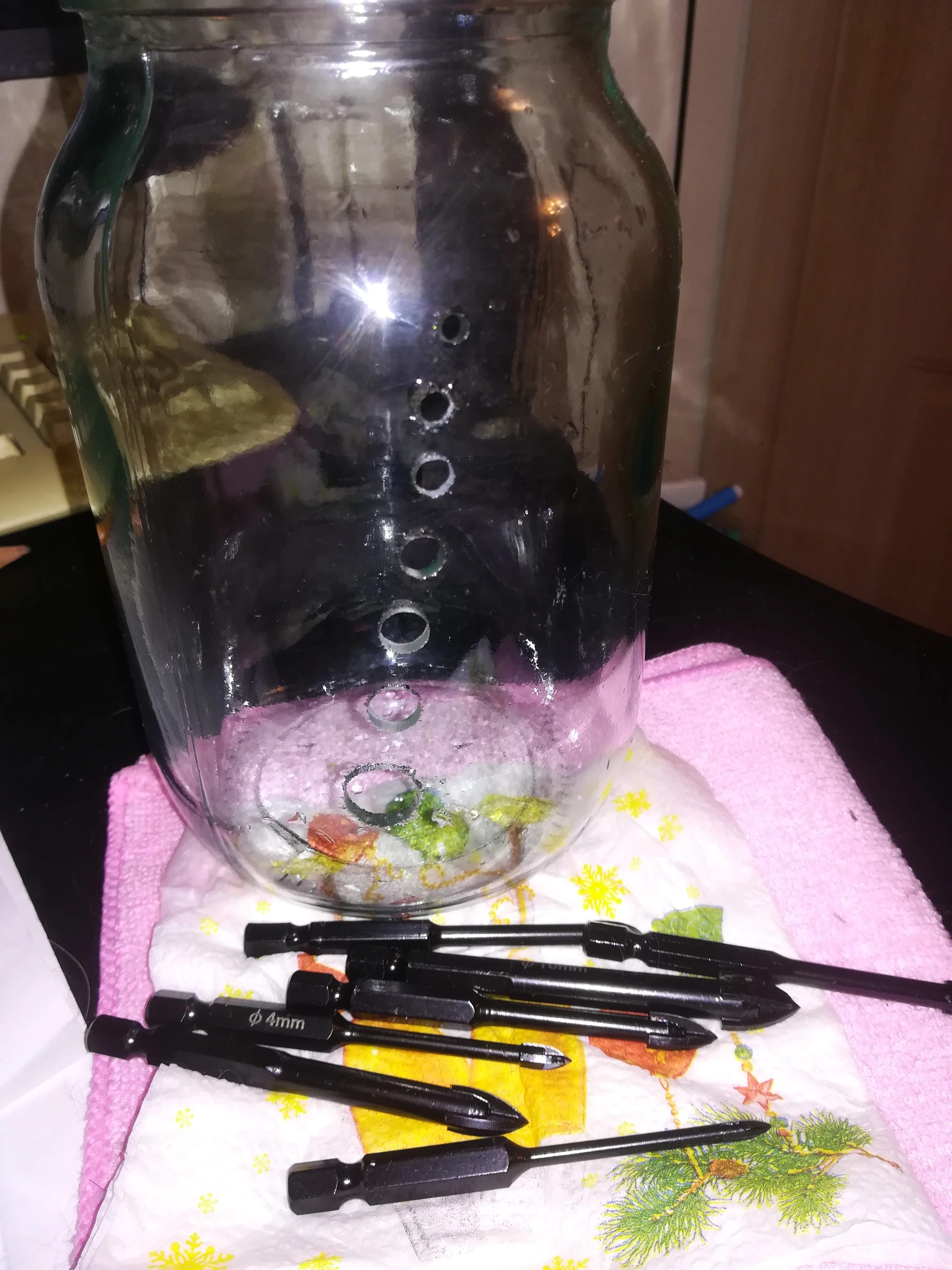 Сверла приехали за 8 дней. 29 декабря отправлен, 6 января доставлен. Качество изготовления на высоте. Одно сверло 6мм имеет небольшое биение. Сверлил банку в воде, подавать нужно строго вертикально, давить совсем немного. На фотографии сколы возникли, когда давил сильнее при выходе сверла из стекла. Я сверлил дрелью, думаю, что на сверлильном станке результат должен быть лучше.