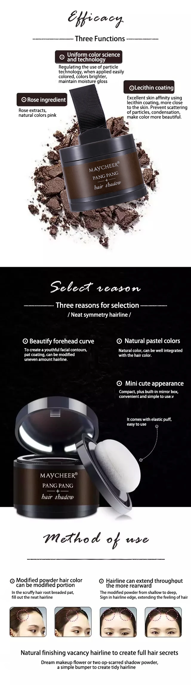 Использование:Откройте маленькую пышку, окунутую в нужное количество, вдоль неопрятного корня волос, мягко коснитесь, заполните аккуратную линию волос.Или погладьте теневой порошок от мелкого до глубокого по краям волосяного покрова, увеличивая ощущение волос. В соответствии с индивидуальнымВыберите цвет для заполнения.Цвета: