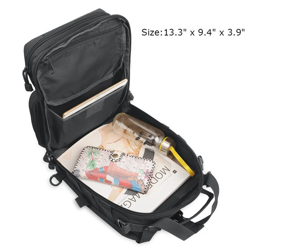 Характеристики: Материал: нейлон 800D Размер: 7,9 "(Д) x 6,3" (Ш) x 12,6 "(В) Основное отделение размер: 7,9 "(L) x 4,7" (Ш) х 12,6 "(H) Верхний карманного формата: 7,9 "(L) x 1,6" (Ш) х 4,3 "(H) Нижний Размер кармана: 7,9 "(Д) x 1,6" (Ш) x 7,1 "(В) Особенности: Тактический штурмовой слинг рюкзак Заполненные Размер: 9,3 "(L) x 3,9" (Д) x 13,3 "(H). Емкость: 20 л. Изготовлен из прочного нейлонового материала 800D, а внутренняя поверхность изготовлена из водонепроницаемого материала. Сумка имеет регулируемый y-образный компрессионный ремешок спереди, чтобы держать нагрузку плотно для лучшего баланса. Слинг-мешок может быть использован в качестве книжного мешка для школы, также может быть использован в качестве мешка диапазона для оружия, боеприпасов, безопасности слуха и т. Д. Рюкзак для путешествий имеет регулируемый и удобный плечевой ремень, а также имеет два небольших ремня, которые помогают уменьшить скорость движения сумки, А также возможность быстро изменить боковую часть ремня для крепления для удобной правой или левой руки. Тактическая Сумка с системой лямки MOLLE, предназначенная для использования в сочетании с другим оборудованием, вы можете загрузить Тактический мешочек, сумку для бутылки с водой, чехол для фонарика, комплекты аксессуаров и другие шестерни molle. Отличные хранилища: 1 основное отделение, 2 нижних передних отделения, 1 верхний передний отсек, 1 мягкий задний карман, 1 карман для карт и 5 внутренних отделений для управления несколькими отделениями. Отлично подходит для переноски вашего маленького планшета, Читалки, а также вашего кошелька, ключей, солнцезащитных очков и других предметов первой необходимости.