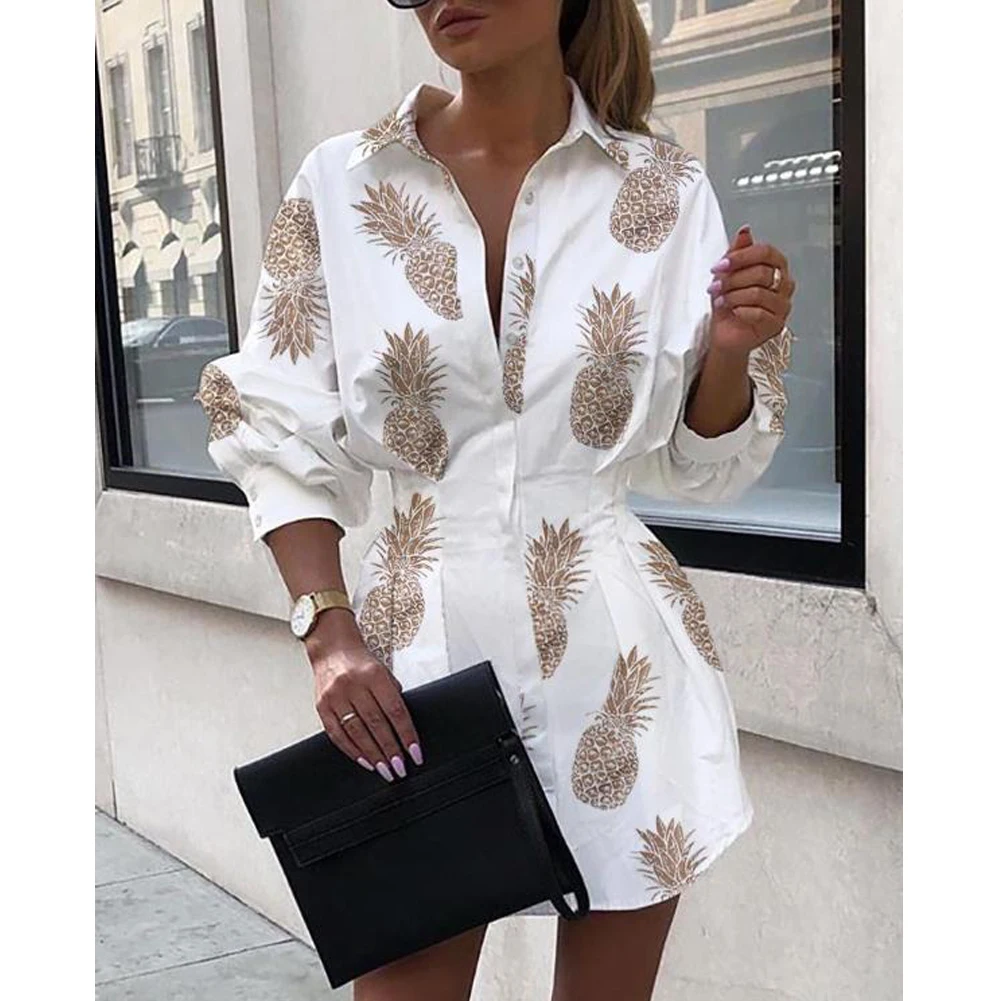 Женское платье-рубашка с отложным воротником и длинным рукавом, Повседневная Туника с принтом ананаса, для офиса и работы, на лето