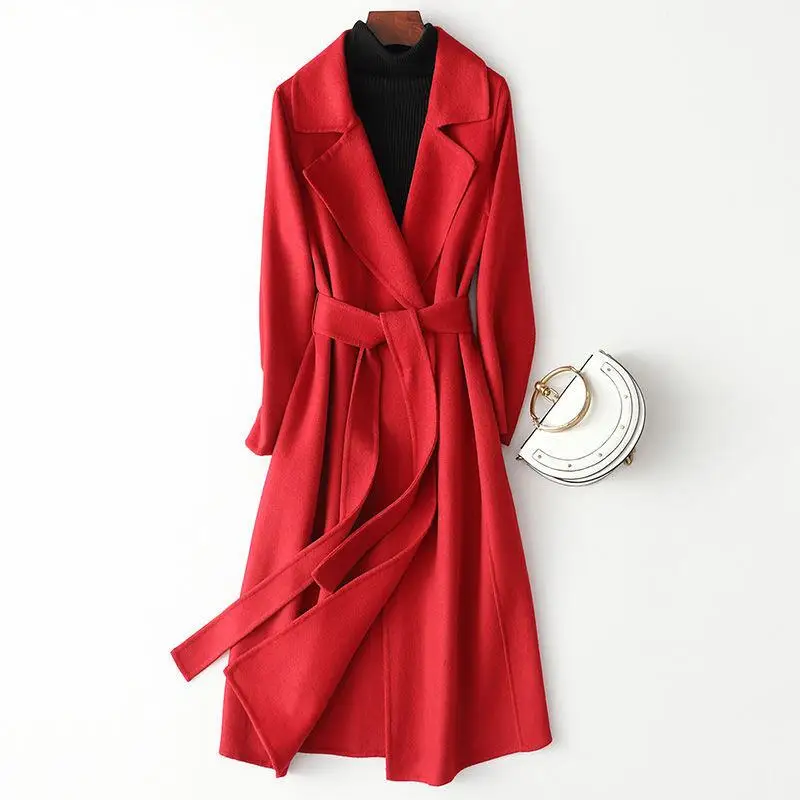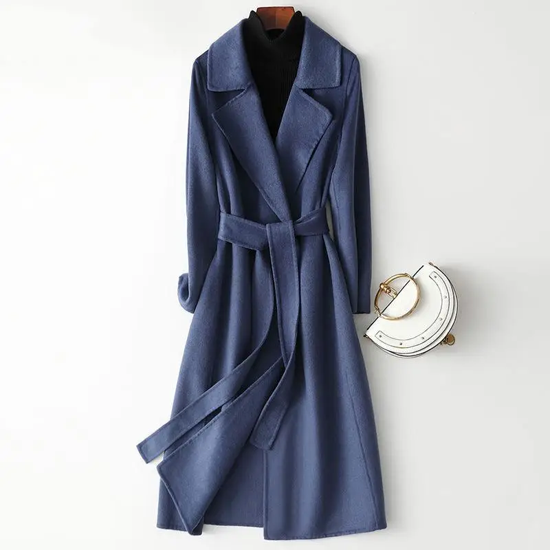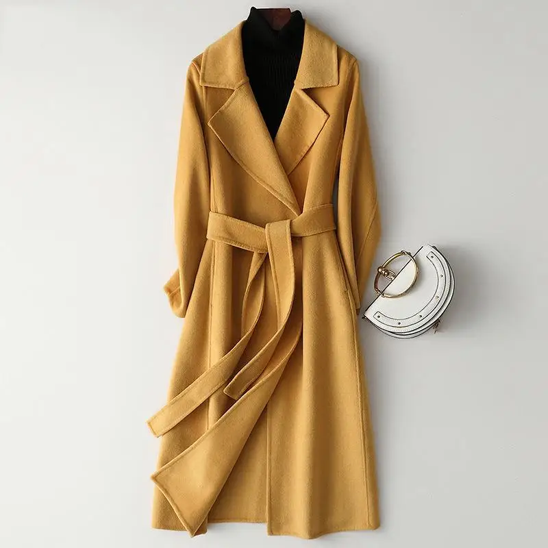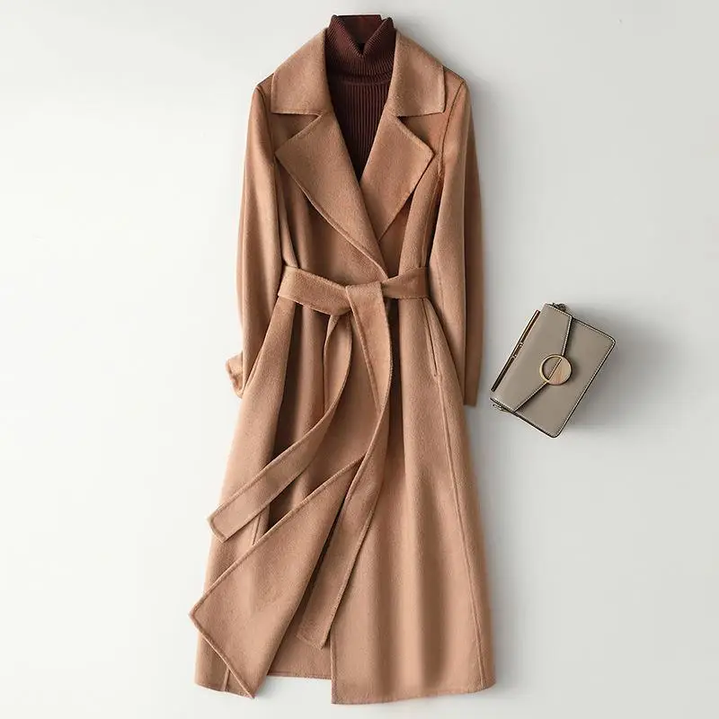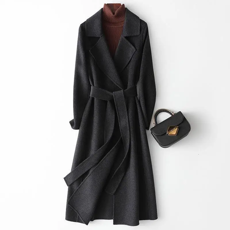 Женское шерстяное пальто, кашемировое пальто с длинным рукавом и поясом, Осень-Зима 100%