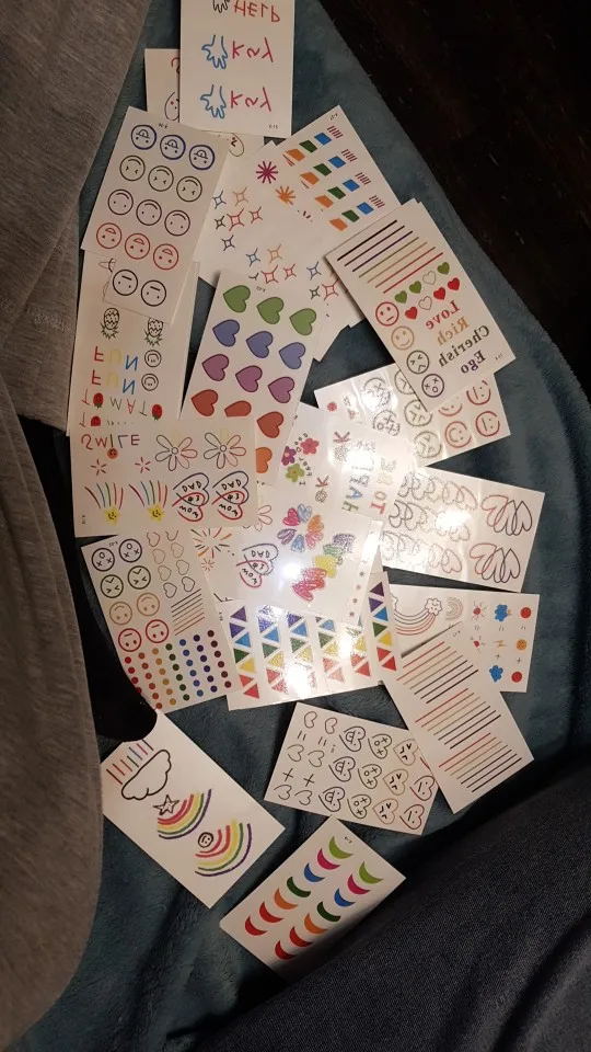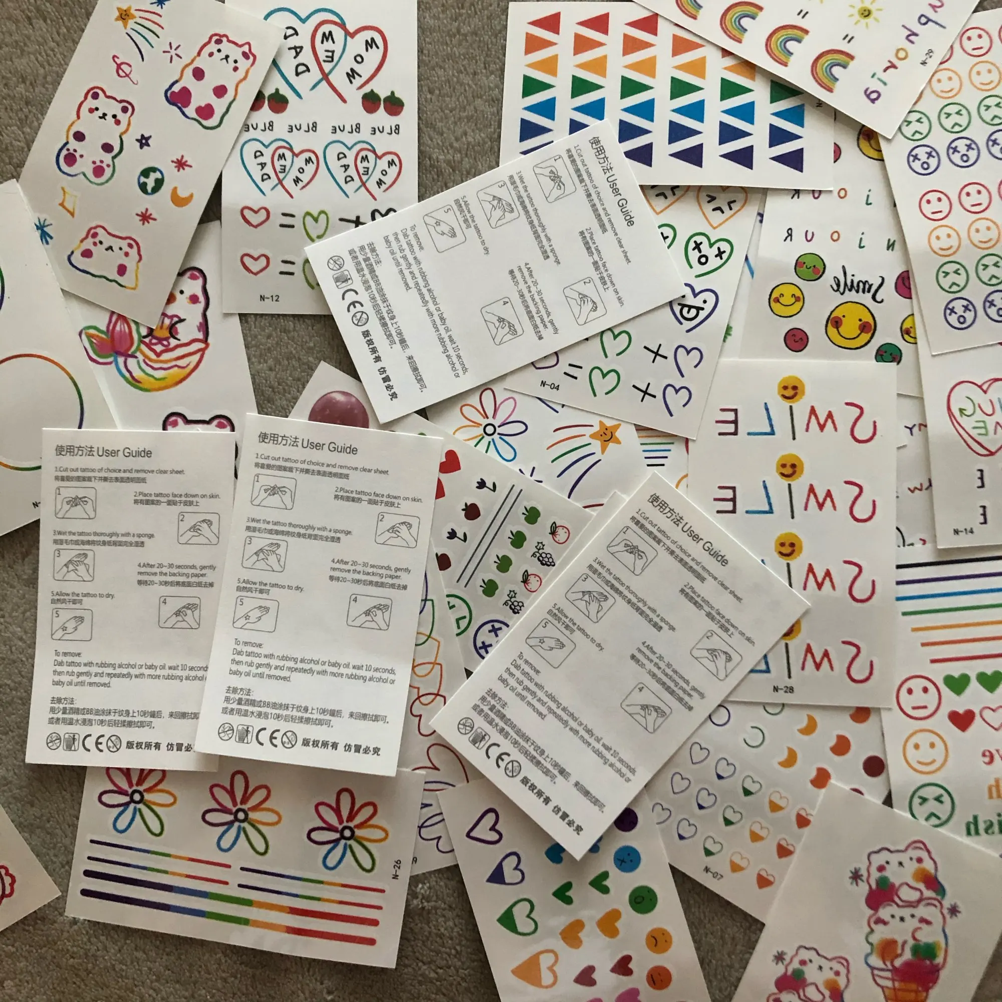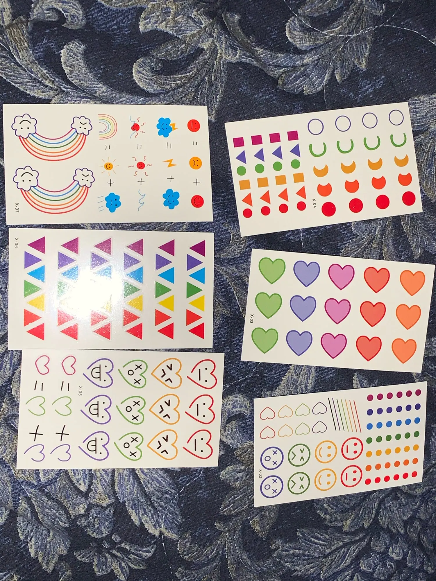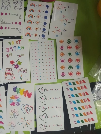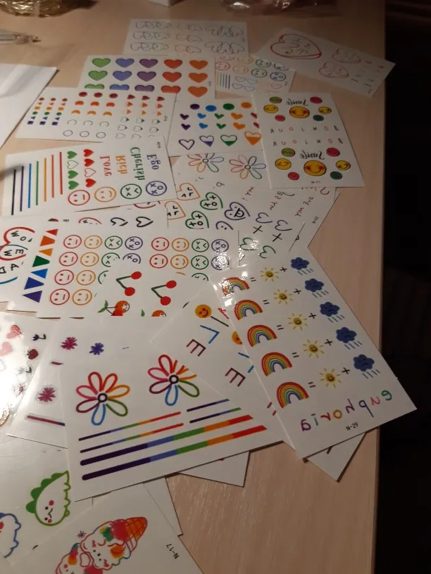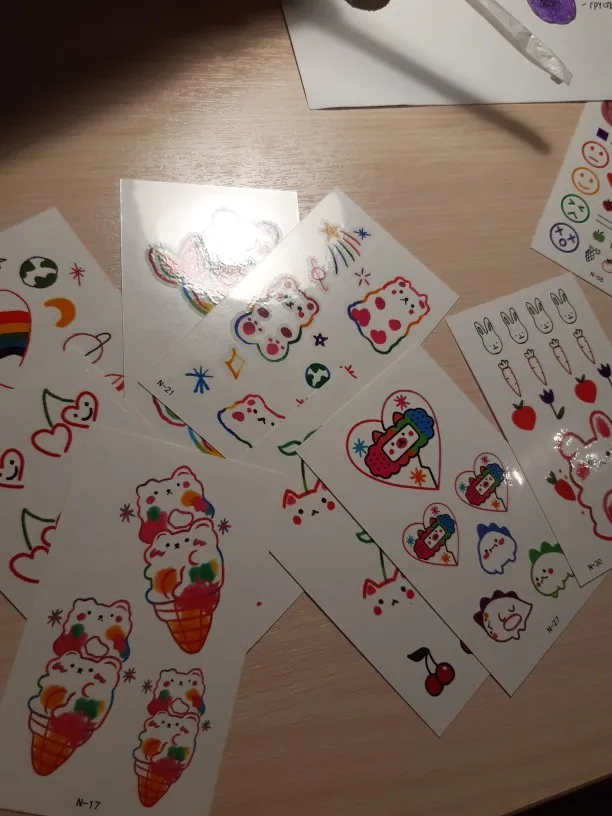 Всё отлично~ Очень милые наклейки, качественные наклейки. Их довольно много. Продолжительность носки зависит от места нанесения. На шее продержалось 3,5 дня, на руке +-2. Ради интереса почему бы и нет;