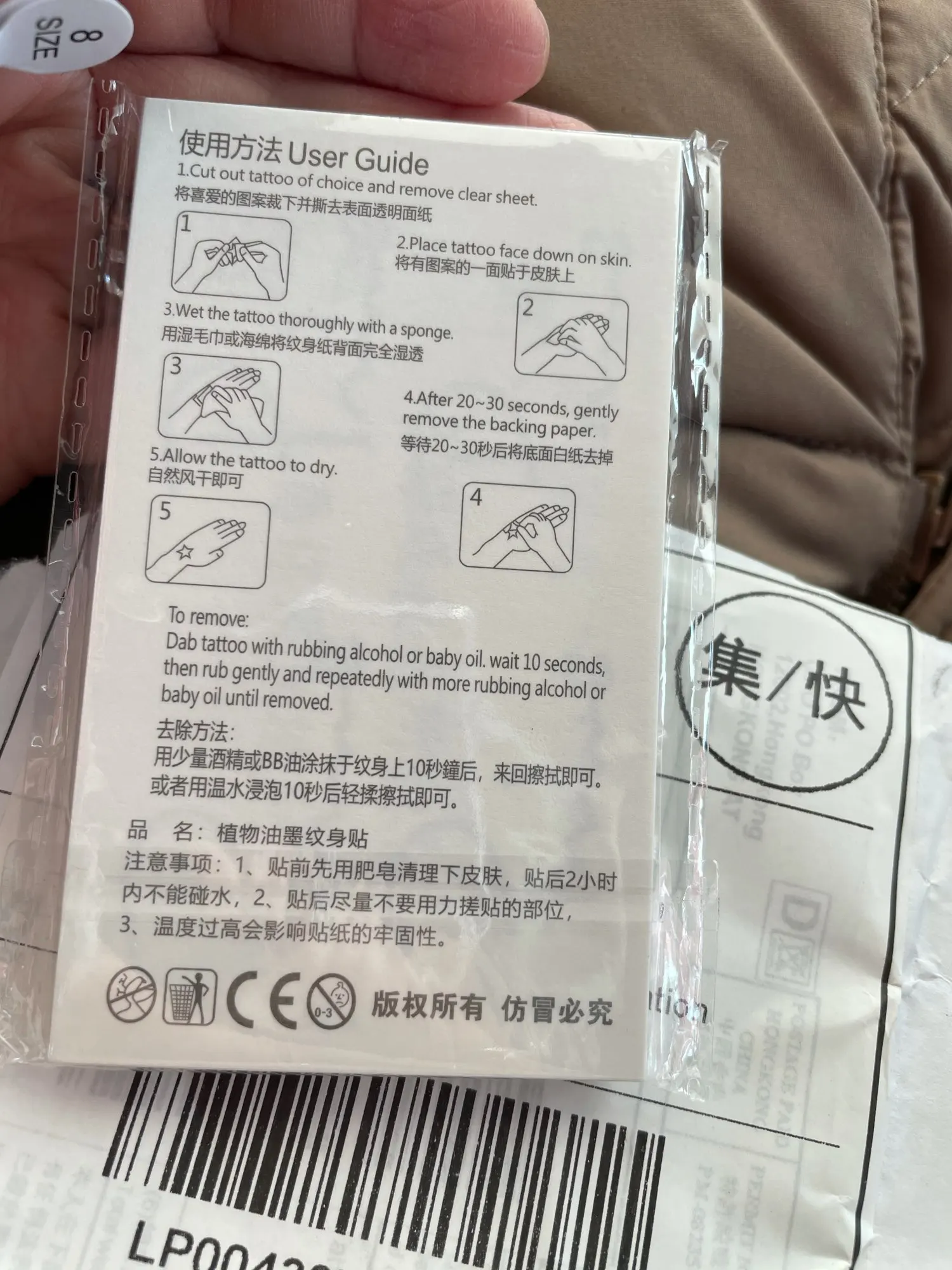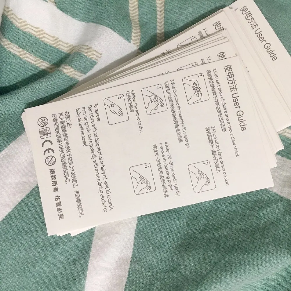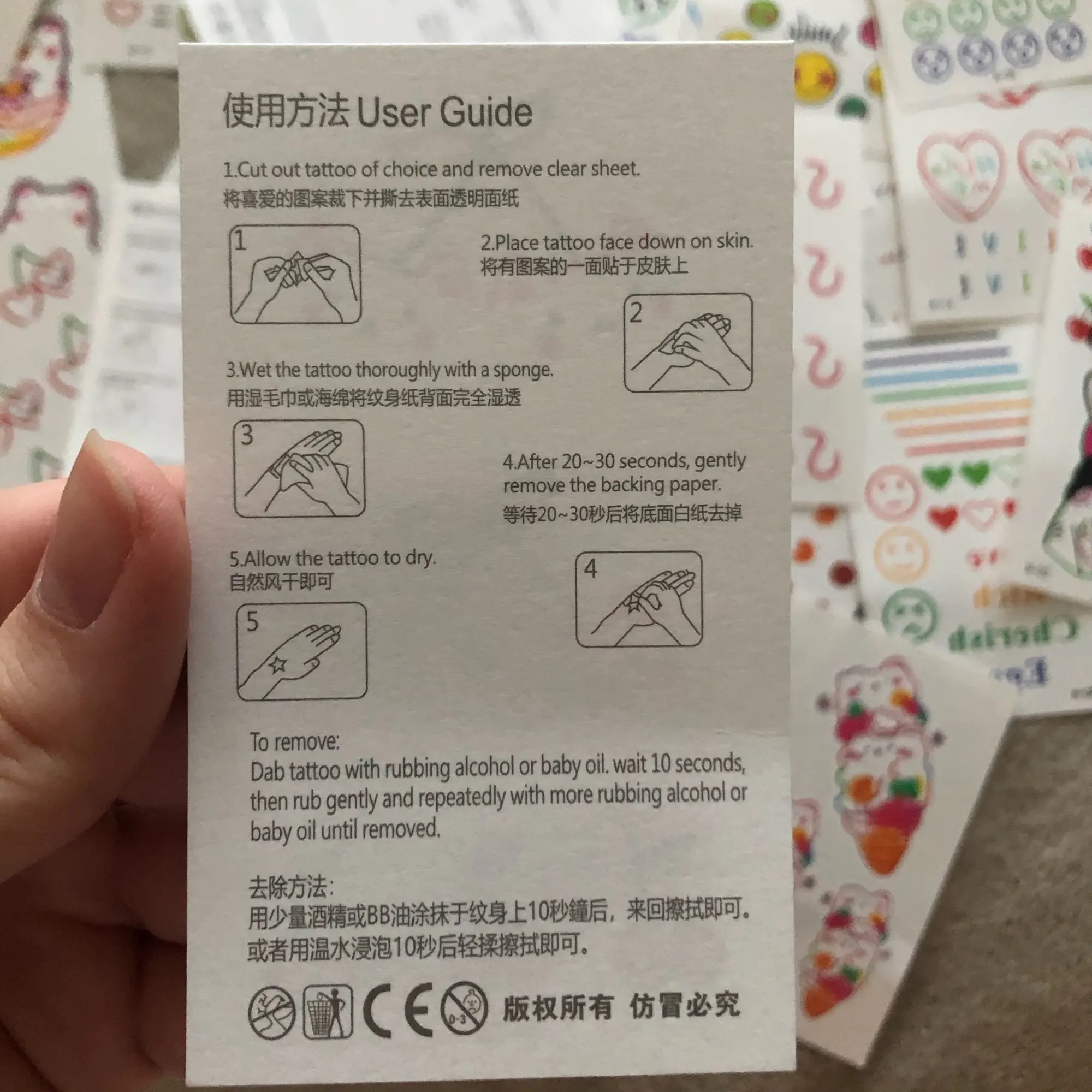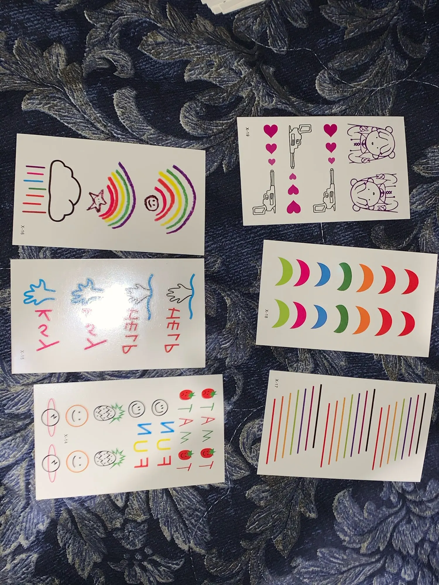 заказ пришёл достаточно быстро , были сомнения что потеряются на почте , но все обошлось. татушки очень красочные , яркие и разнообразные . на каждом обороте есть инструкция на японском (?точно ли на японском?), но по картинкам все очень даже понятно. на двух трёх листках с рисунками , присутствуют мелкие недочеты и/или плохо пропечатана картинка , но это не столь видно и в глаза не бросается. заказом довольна. если есть сомнения - брать не брать , возьмите , не пожелтеете <3