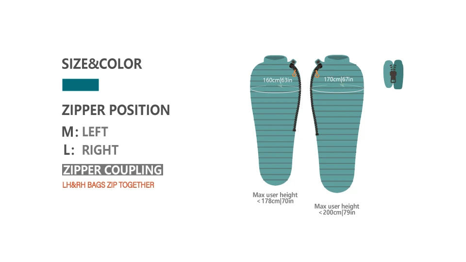 Вес спального мешка: M-506g ; L-574g (не включает компрессионный мешок и вес мешка для хранения)