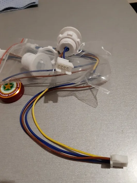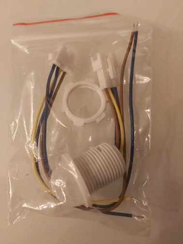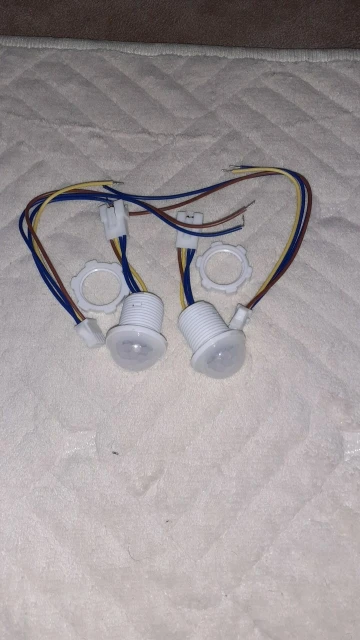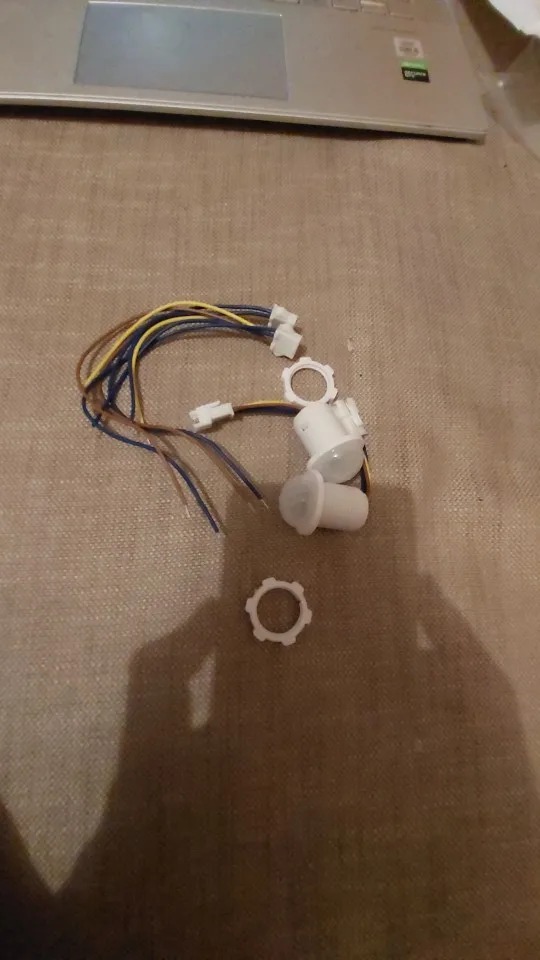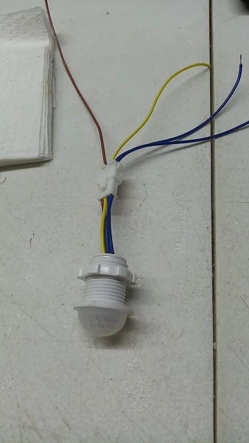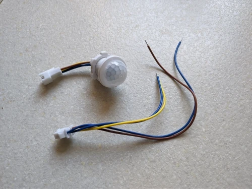 Хороший датчик, влез в распределительную коробку для проводов идеально. Два длинных провода на сеть 220, синий ноль, желтый(красный) фаза, два коротких на цоколь лампы, там без разницы, но лучше фазу на центр. Срабатывает уже в сумерках, днём не работает, но можно проверить, прикрыв его рукой. Расстояние включения датчика 3-4 метра, на секунд 35.