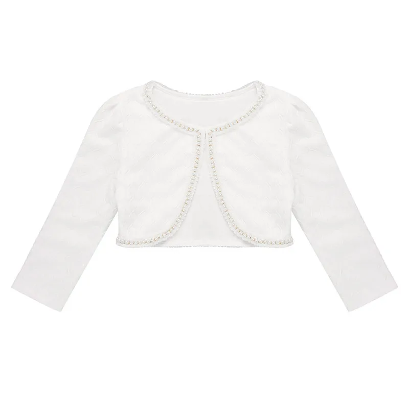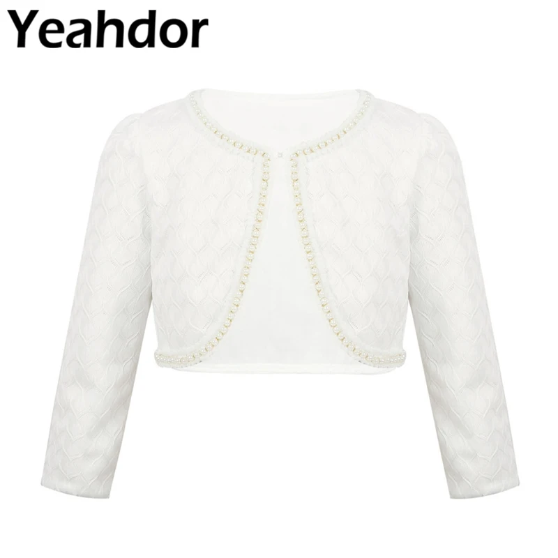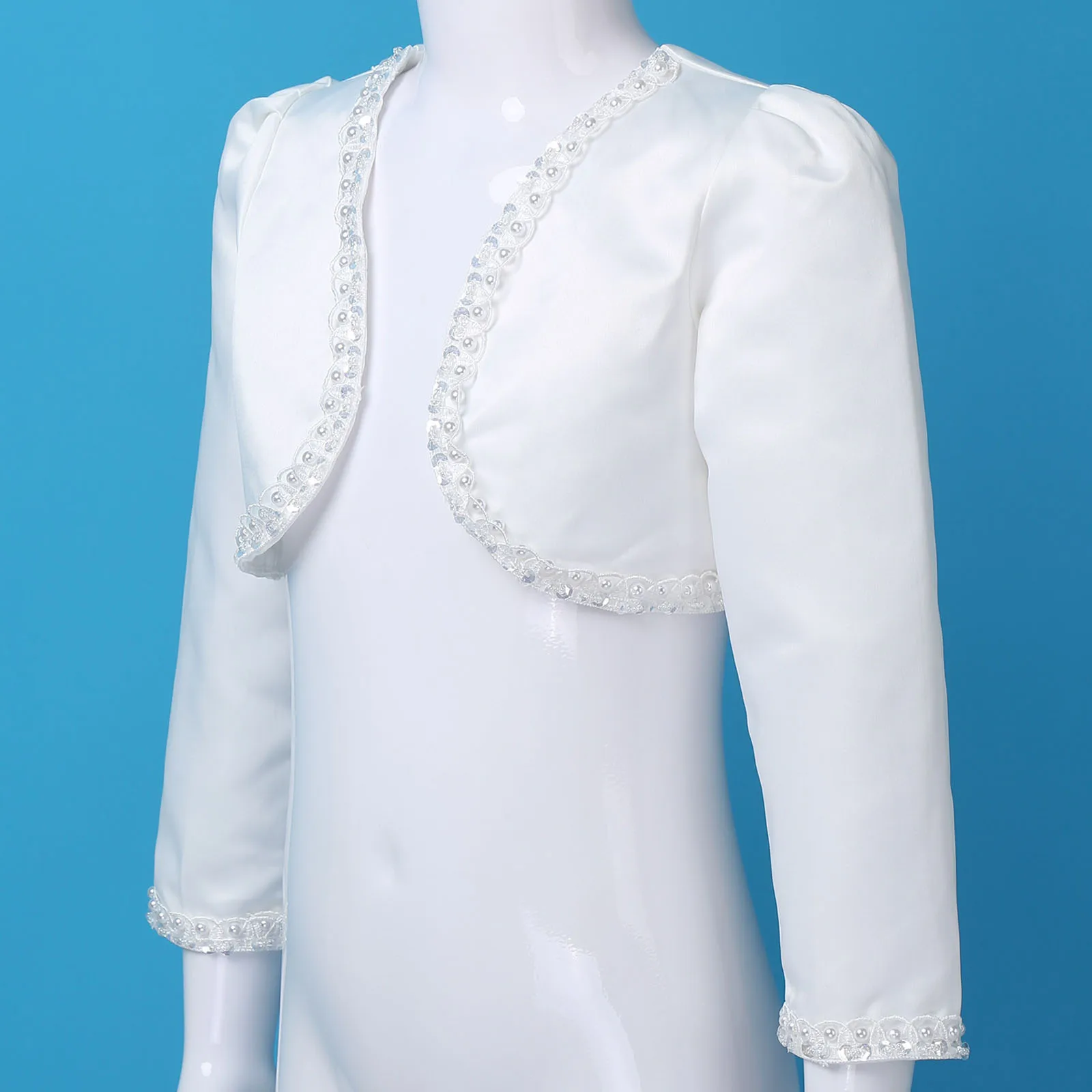 Белое детское болеро с длинными рукавами и кружевами и бусинами на одной пуговице, болеро, кардиган, топ, короткая куртка для торжеств, свадебных торжеств