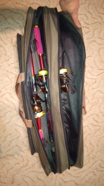 чехол сделан качественно. размером большой, мне нужно было под 2 удочки, но туда и 5 в один отсек спокойно влезут. материал качественный. испытаю только весной или летом. нужно будет еще коробочку под принадлежности в маленький отсек