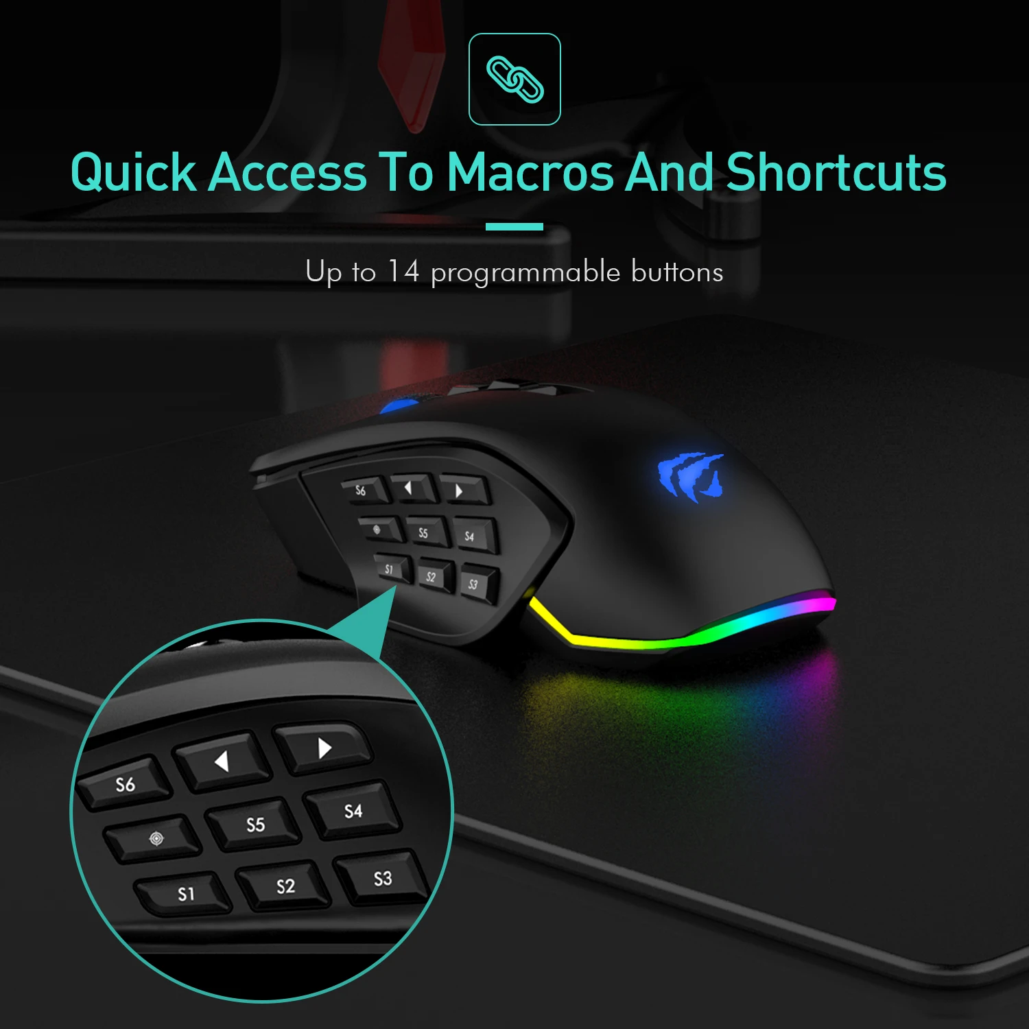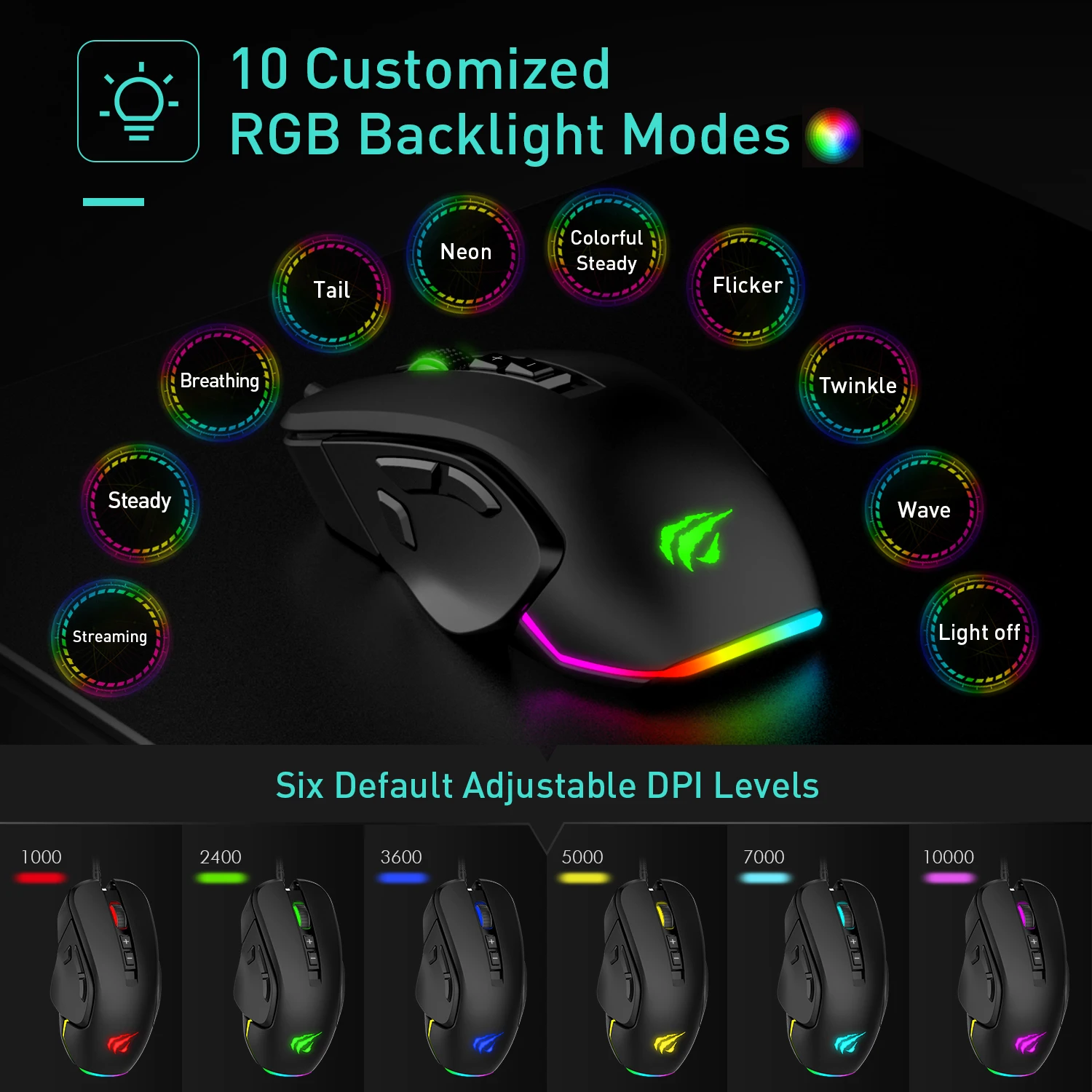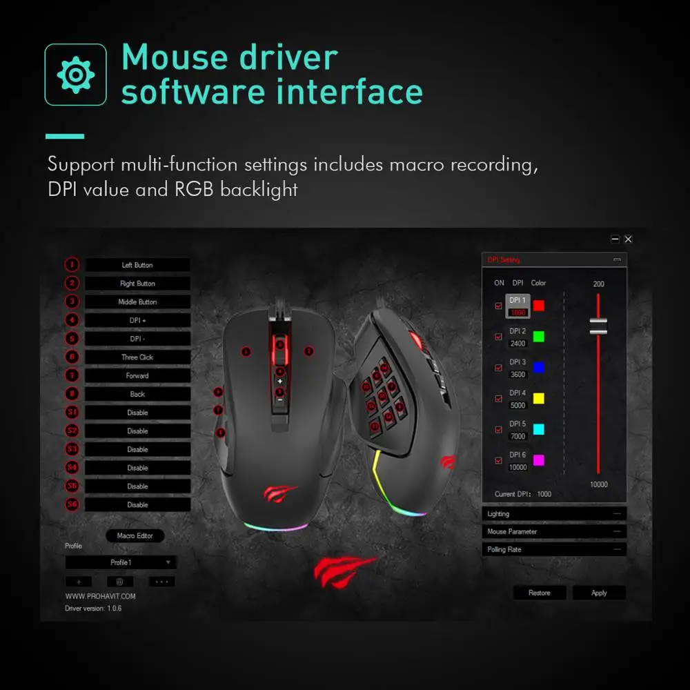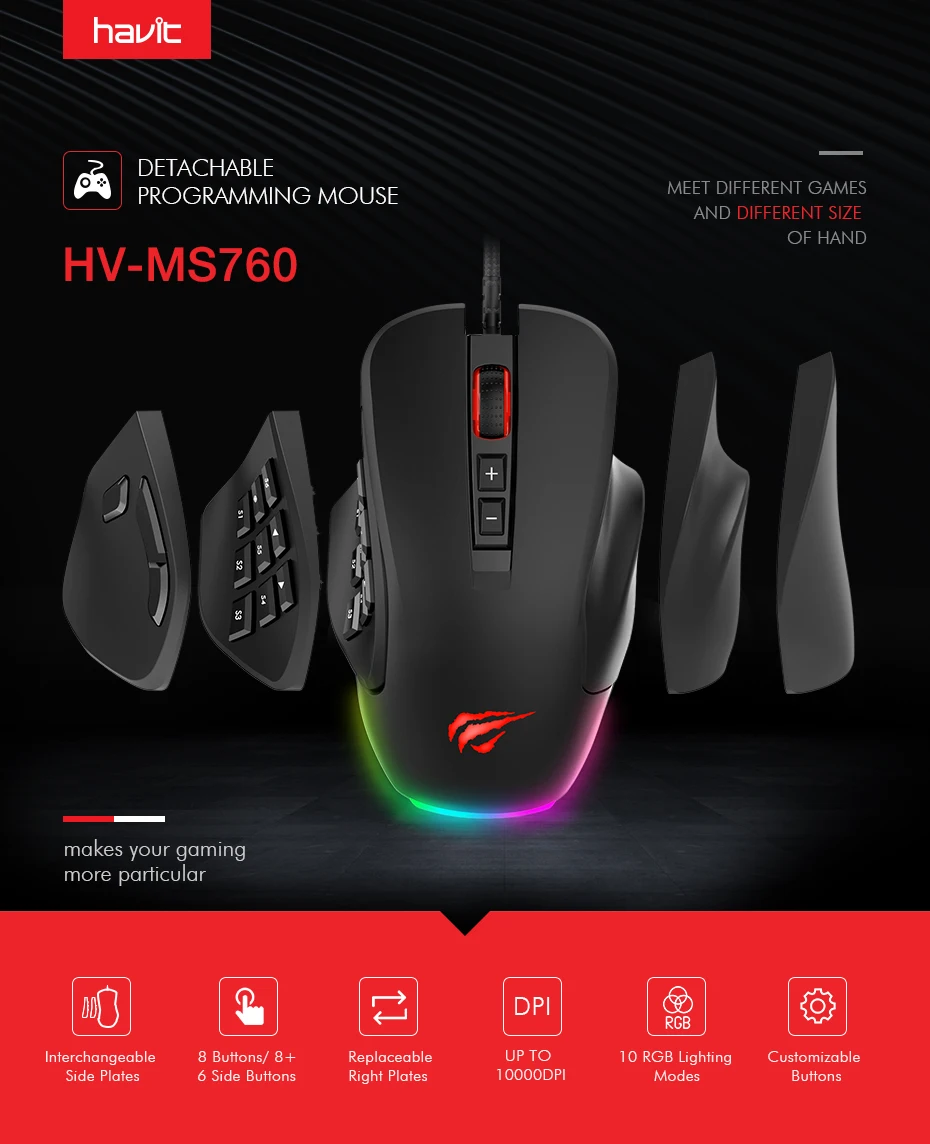 【Replaceable Left Plates Programmable Gaming Mouse】Option 1: Use the panel with forward, backward and fire button; option 2: use the panel with extra 6 buttons (S1-S6), then you can program 14 buttons to make performing in-game actions much faster. 【Interchangeable Right Plates Ergonomic Mouse】The replaceable right panel is suitable for both big and small hands, adopts skin friendly smooth materials and ergonomic shape to help reduce hands fatigue. 【10 Customizable RGB Mouse for laptop】Press "backward" button + "scroll wheel" button to switch among 10 different unique RGB pre-setting light modes or switch the light off. The light colour, brightness level, breathing speed and effect can be changed to suit your needs through the driver. 【High Precision Computer Mouse】The wired mouse DPI levels from 1200 to 12000(adjust through driver at your need) ensure fast and precise movement during different games. Polling rate: 125/ 250/ 500/ 1000 Hz. 【Plug&Play Mice, Wide Compatibility】- If programmed needed, pleas go ahead to download the driver(Version: 1.0.6) via:http://www.havit.hk/downloads/ at your need. Note: Programming function is NOT supported under Mac/ Linux system.