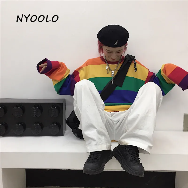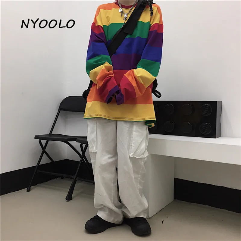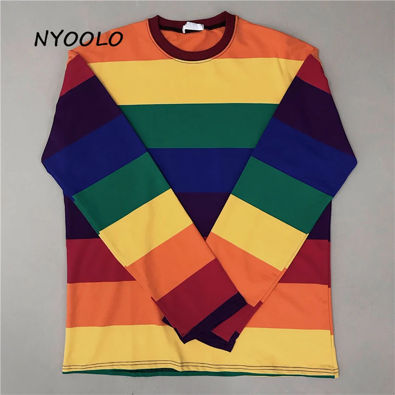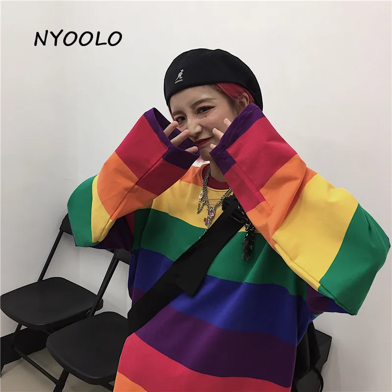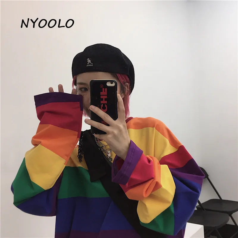 NYOOLO Harajuku винтажная Радужная полосатая Лоскутная свободная футболка Топы Осенняя уличная одежда с длинным рукавом хлопковая Футболка женская одежда