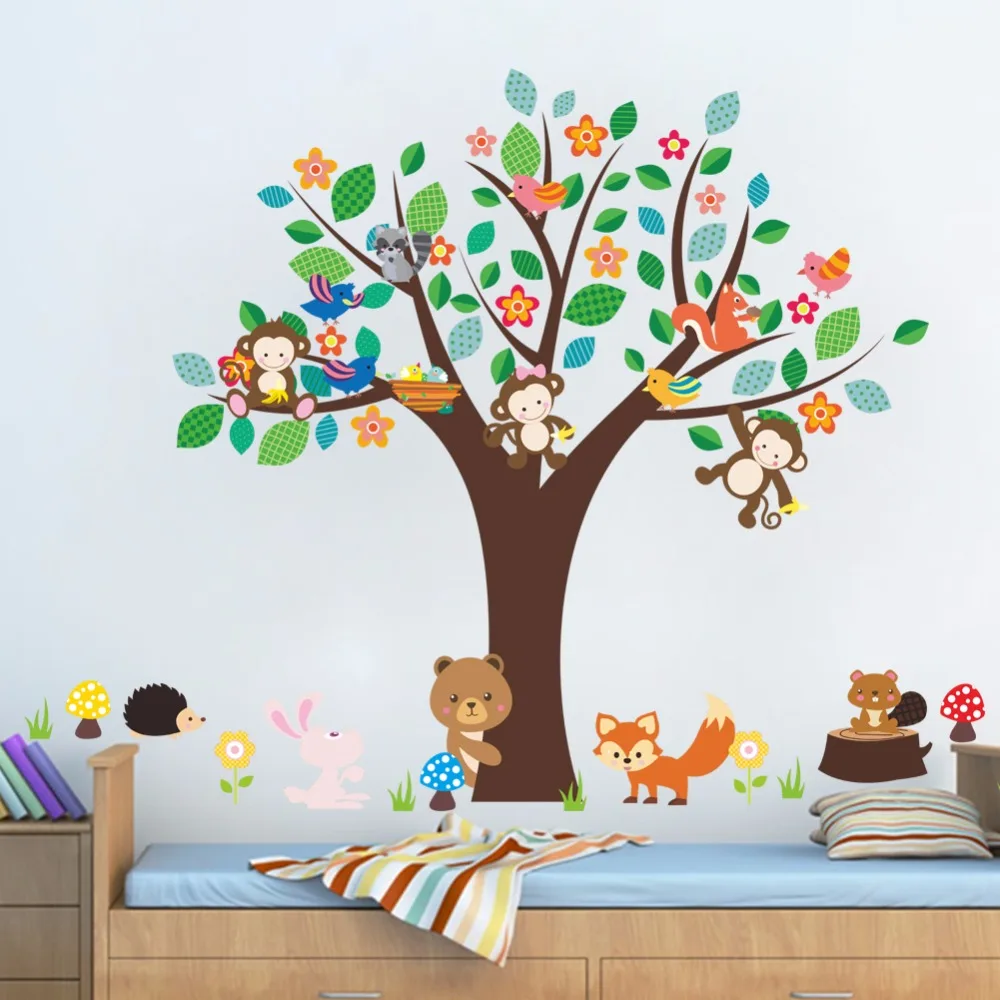 Лесные животные дерево наклейки на стену для детской комнаты Обезьяна Сова джунгли дикая Наклейка на стену детская спальня декор плакат на стену 1 шт.
