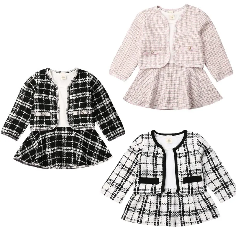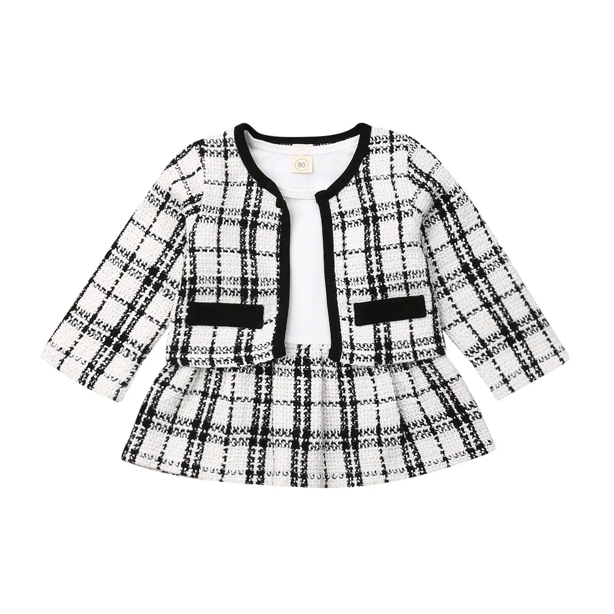 Коллекция 2020 года, модные комплекты одежды для маленьких девочек пальто в клетку с длинными рукавами для дня рождения Топы + платье, 2 предмета, вечерние, теплые наряды, От 1 до 6 лет