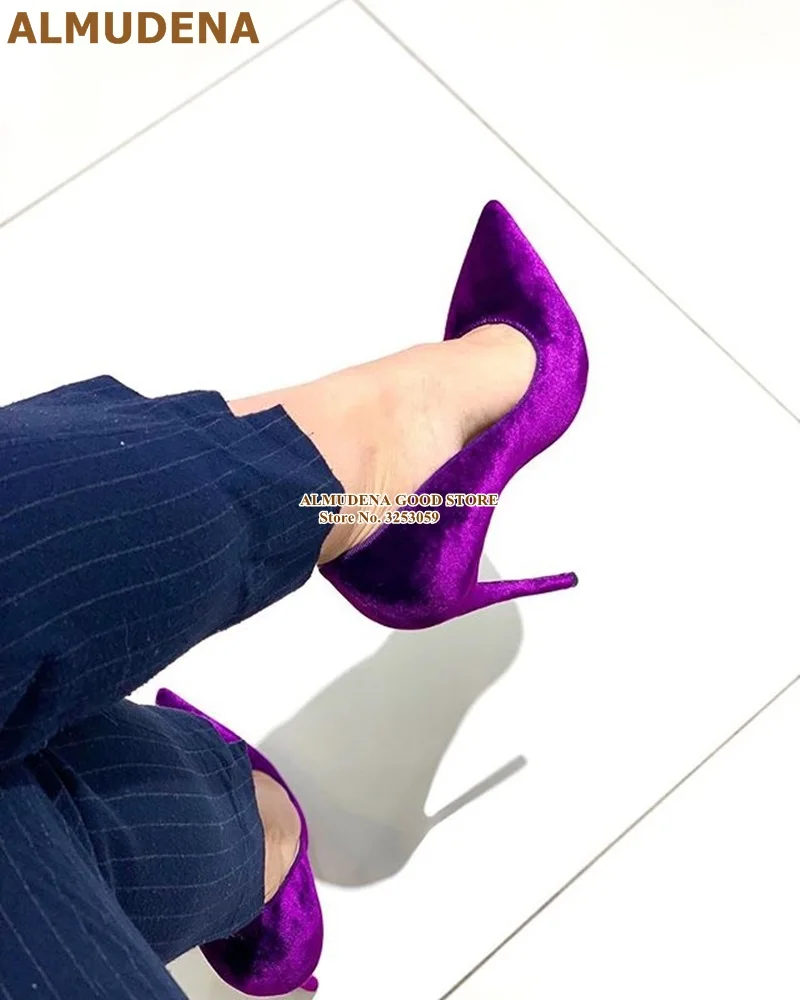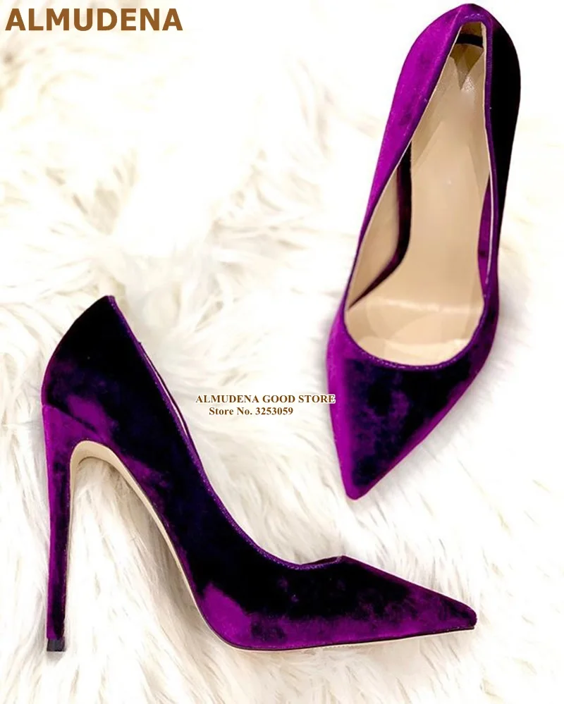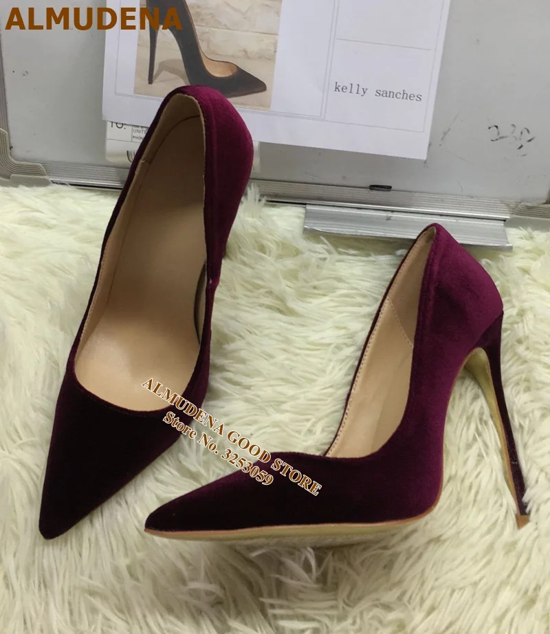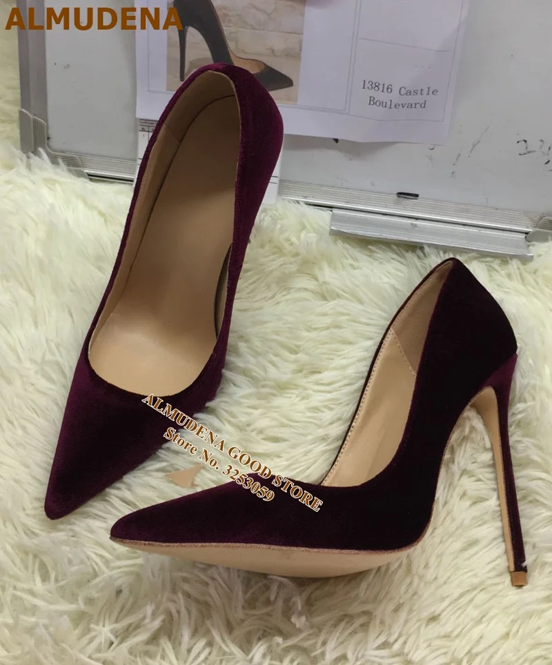 Роскошные бархатные туфли-лодочки ALMUDENA с острым носком, туфли-лодочки на шпильке с закрытым каблуком 12, 10, 8 см, свадебные туфли винного, красного, фиолетового цветов, размер 45